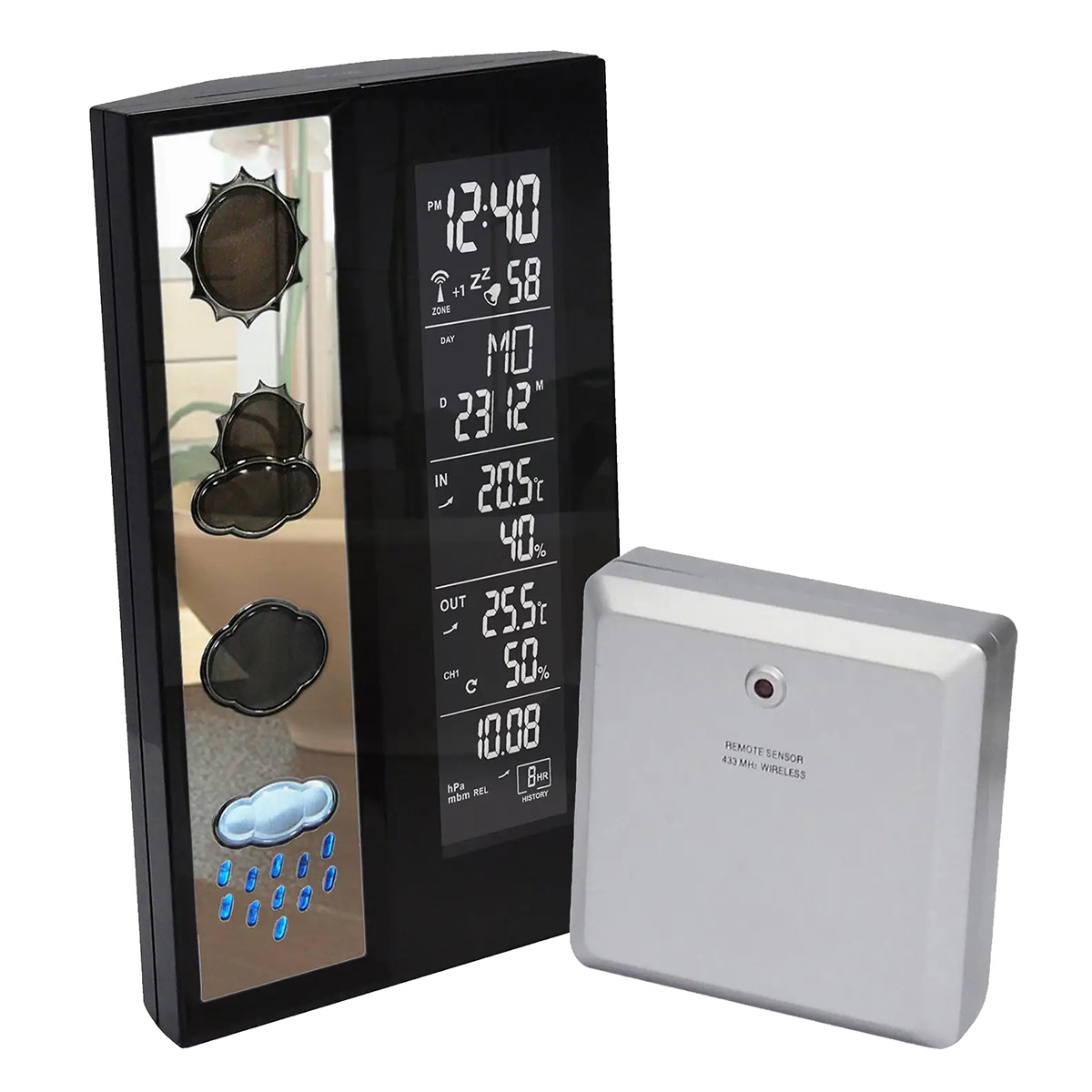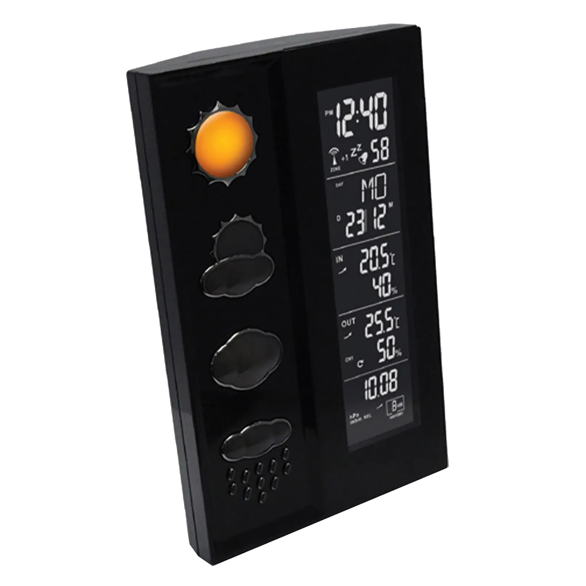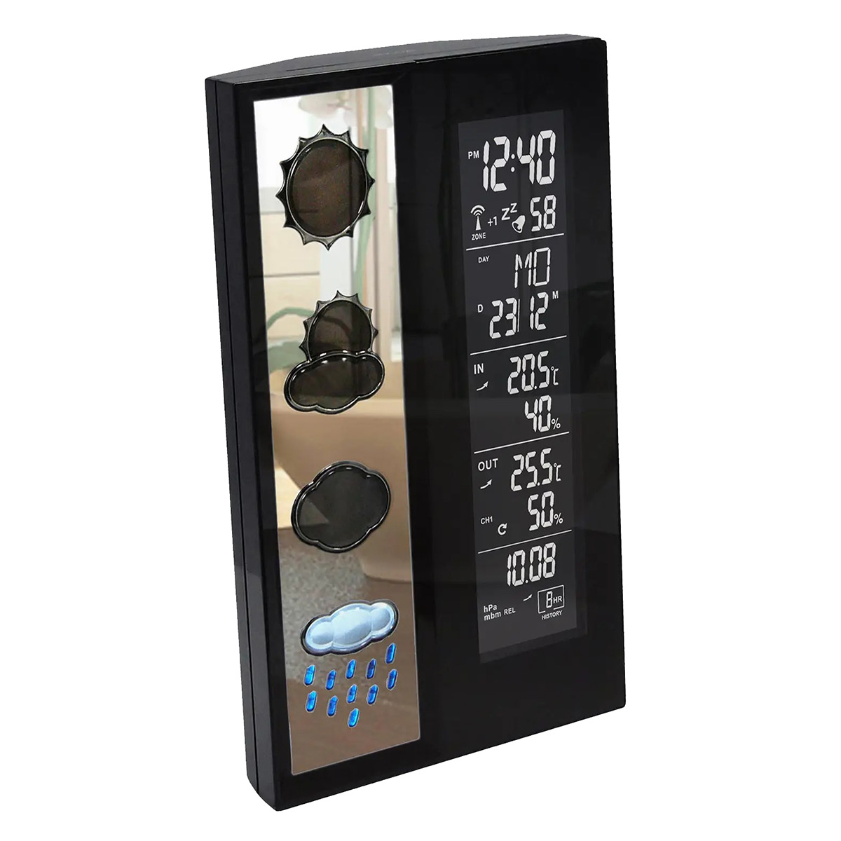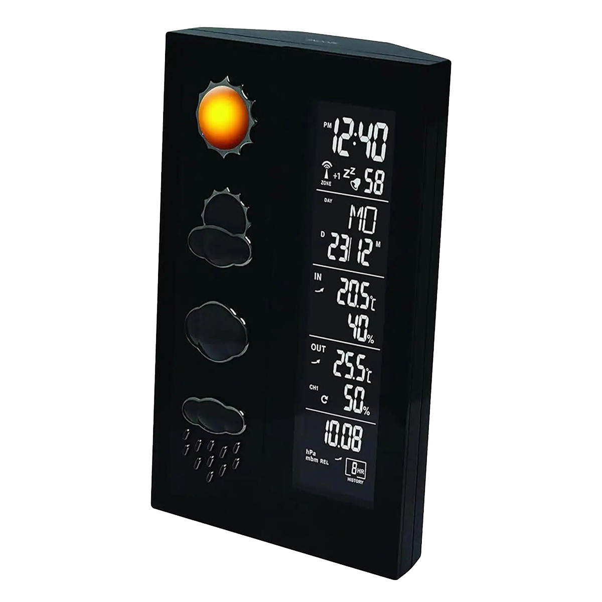 - Символьний прогноз погоди (зліва на корпусі підсвічуються погодні іконки: сонячно, мінлива хмарність, хмарно, дощ)