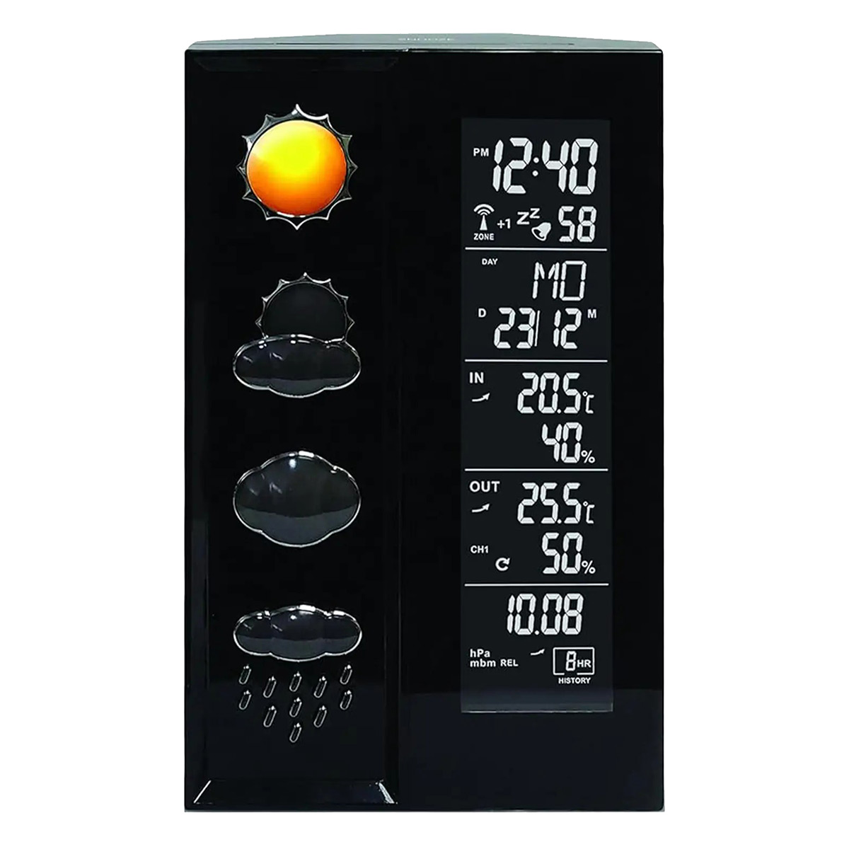 На лаконічному монохромному дисплеї з вертикальним розподілом інформації відображається цифровий показник поточного атмосферного тиску та його історія за останні 12 годин, температура та вологість у приміщенні, а також температура та вологість зовнішнього середовища завдяки бездротовому виносному датчику, дата та день тижня, а також годинник. Прогноз погоди на наступні 12-24 години відображається з лівої сторони корпусу за допомогою підсвічування відповідного погодного символу. Прогноз має високу точність, оскільки формується на основі зміни тиску, температури та вологості.