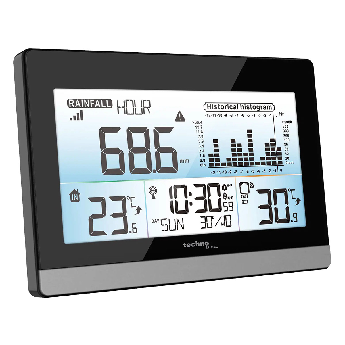 Дані про опади можна переглядати у вигляді числового показника та графіка за певний програмований проміжок часу в мм або дюймах. Крім, вже згаданого відображення температури у приміщенні та ззовні, метеостанція також транслює тенденцію зміни температури, даючи змогу бути в курсі майбутніх метеорологічних змін.