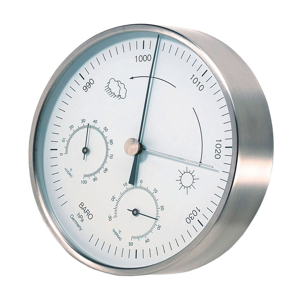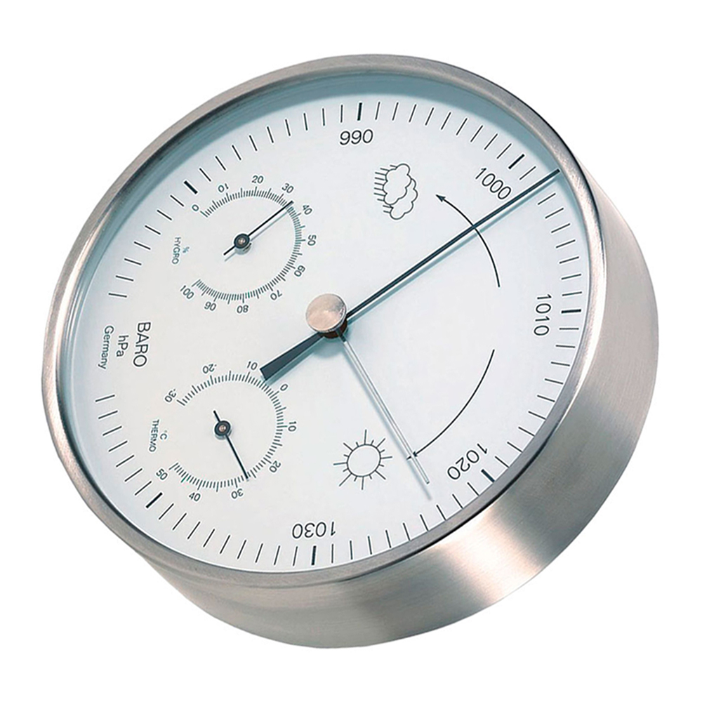Метеостанція поєднує в собі механічний барометр, термометр і гігрометр. Барометр вимірює атмосферний тиск і за допомогою двох погодних символів на циферблаті показує місцевий прогноз погоди: підвищення тиску свідчить про покращення погоди, а його зниження повідомляє про ймовірність дощу або грози. Термометр відображає температуру повітря, а гігрометр – відносну вологість. Завдяки цим даним можна отримати повне уявлення про поточні та майбутні погодні умови.