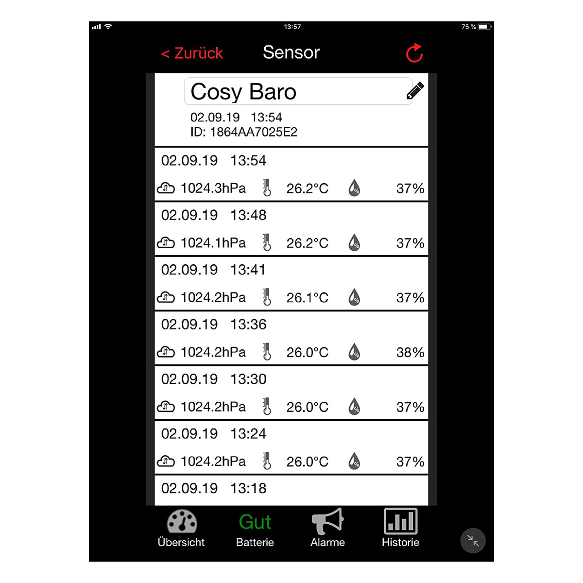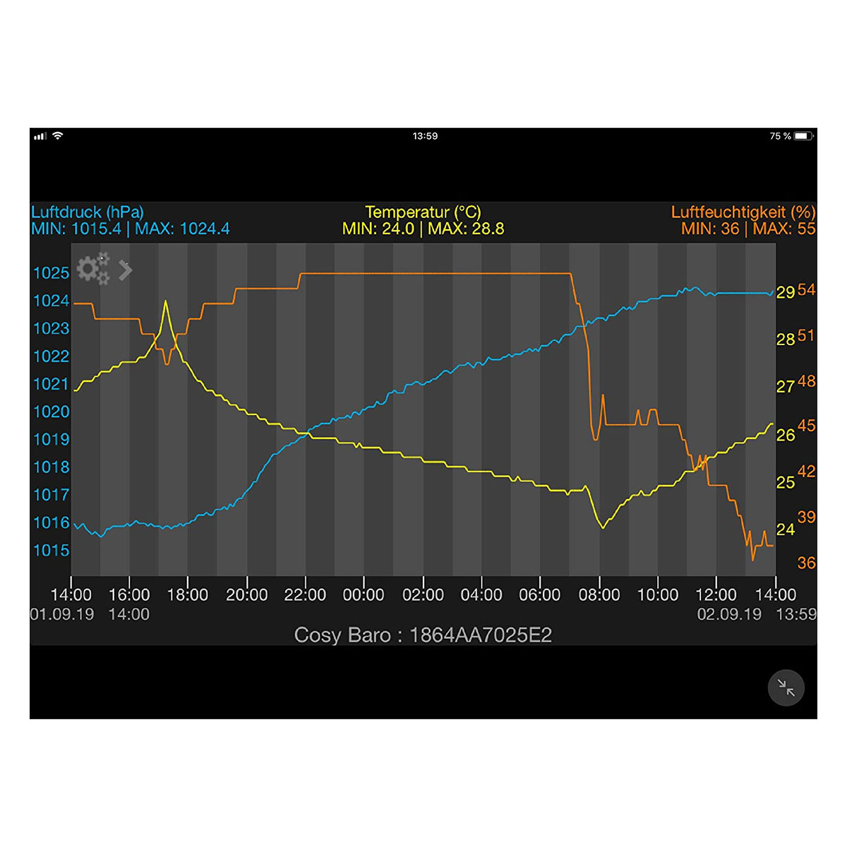 TFA Cosy Baro може підключатися до системи WeatherHub SmartHome, що робить цю модель ще й метеостанцією для смартфона. Слідкуйте за інформацією за допомогою смартфона та спеціальної програми TFA WeatherHub (доступно для Android та iOS). Програма має функцію push-повідомлень, які сповіщатимуть про будь-які зміни. Усі погодні дані супроводжуються діаграмами та графіками, а також зберігаються на сервері до 90 днів.