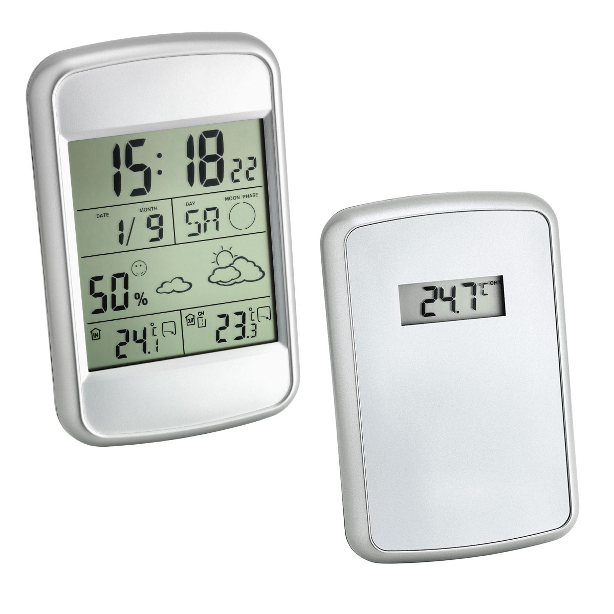 TFA Look – це цифрова метеостанція з мінімалістичним дизайном та монохромним дисплеєм, який відображає символьний прогноз погоди, дані про температуру та вологість повітря, фазу Місяця, а також годинник та календар.