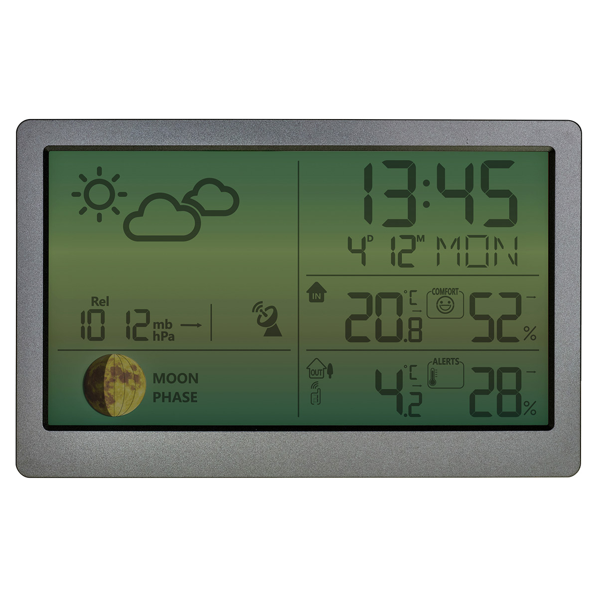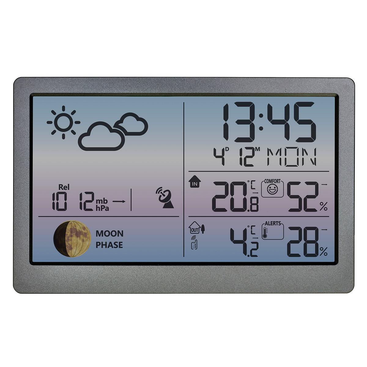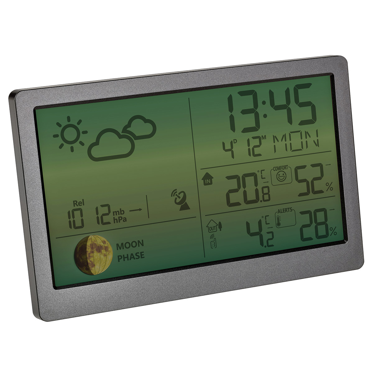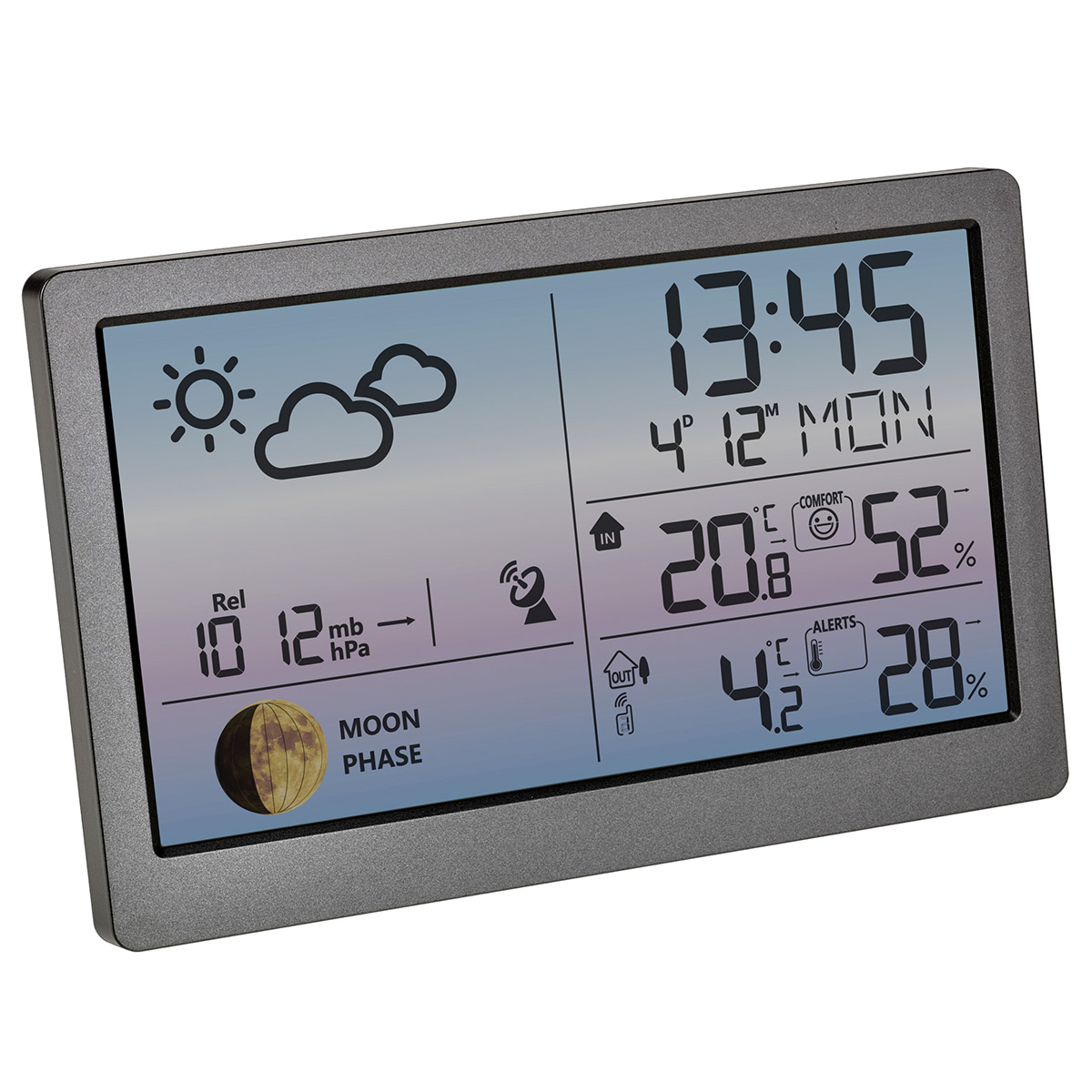 Метеостанція TFA LUNA SKY вирізняється оригінальним дизайном дисплея, який відображає всі необхідні погодні дані. Інформація подається на фоні ніжних синьо-жовто-фіолетових відтінків, що нагадують сутінкове небо. Крім того, золотисто-жовтим кольором світиться зображення Місяця із деталізованою поверхнею, показуючи поточну фазу, яку можна спостерігати в небі.