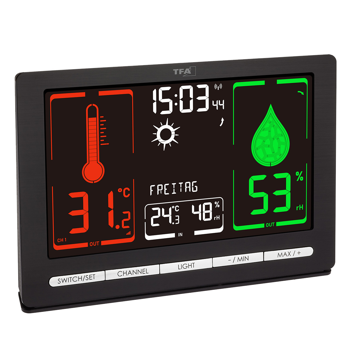 TFA Meteochrome Black – це сучасна домашня метеостанція з кольоровим VA-дисплеєм та бездротовим виносним датчиком. Метеостанція не тільки достовірно інформує про поточні погодні дані, а й завдяки чіткому та барвистому відображенню температури та вологості, дозволяє отримати естетичне задоволення від зчитування виміряних значень. Так, наприклад, світло-зелений термометр сигналізує про помірну, схожу на весняну температуру, червоний термометр попереджає про спеку, густі сині краплі вказують на високу вологість, а потріскана оранжева крапля на низьку. Символ погоди, розміщений у центрі, точно ілюструє прогноз на найближчі 12-24 години: сонячно, мінлива хмарність, хмарно, дощ, гроза або сніг. Наявність функцій годинника та календаря додають метеостанції практичності.