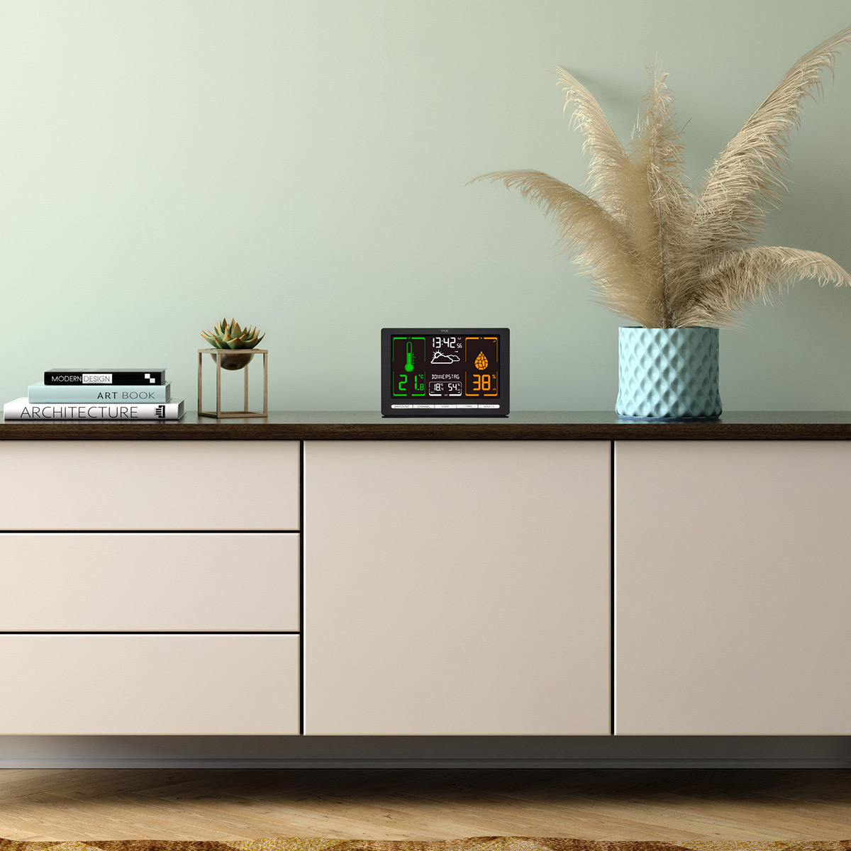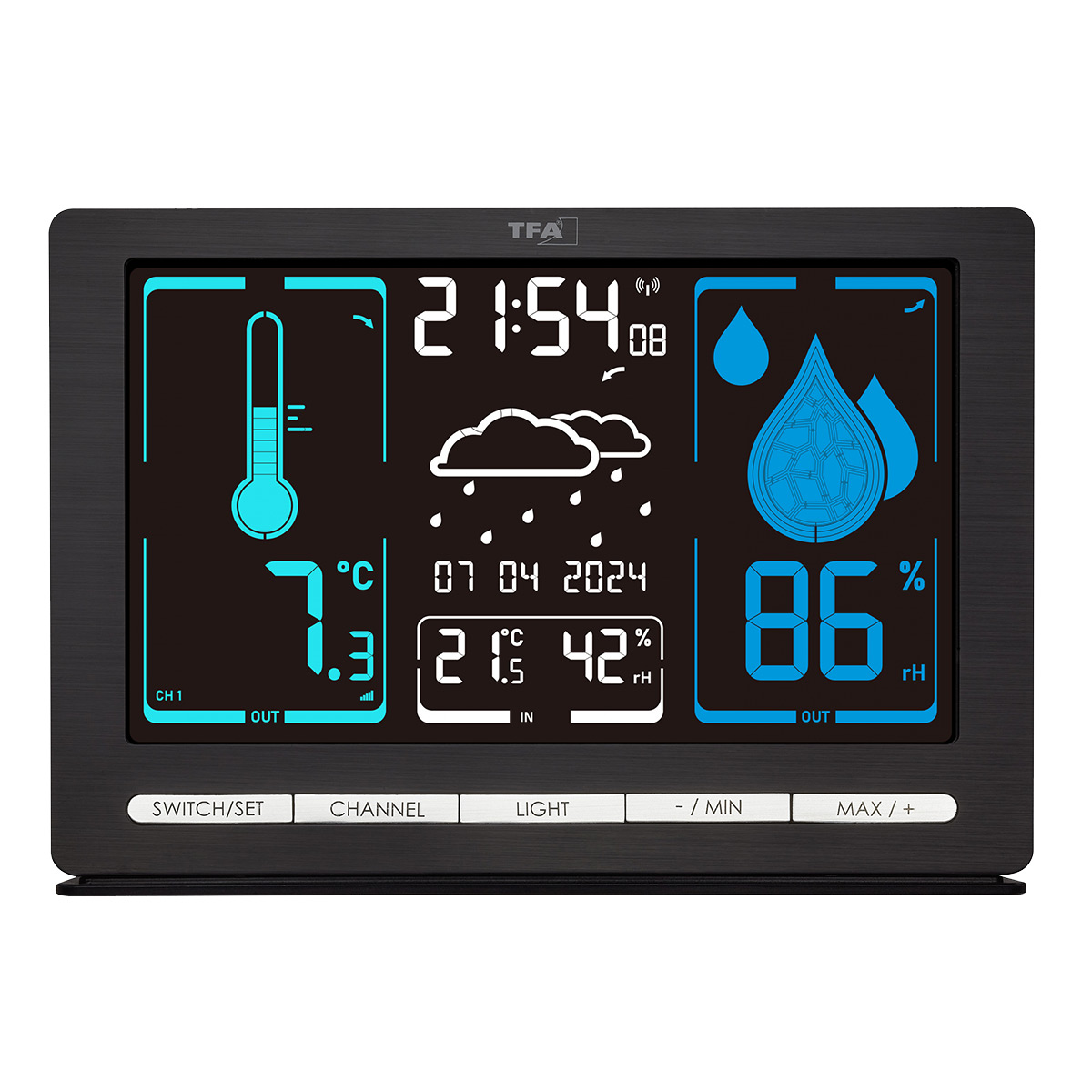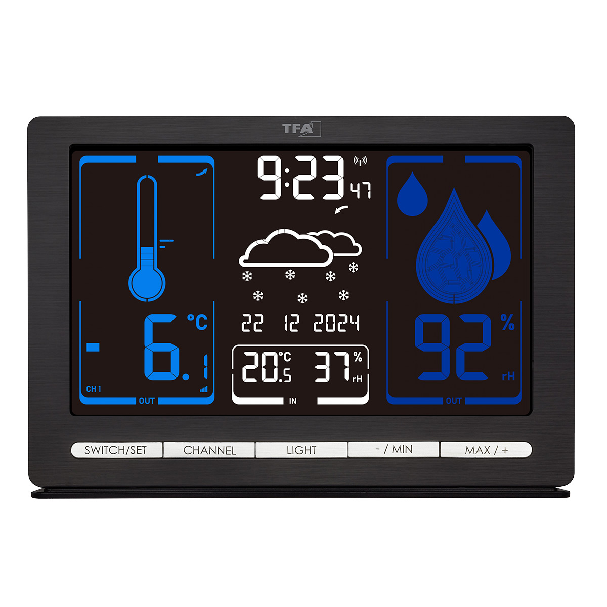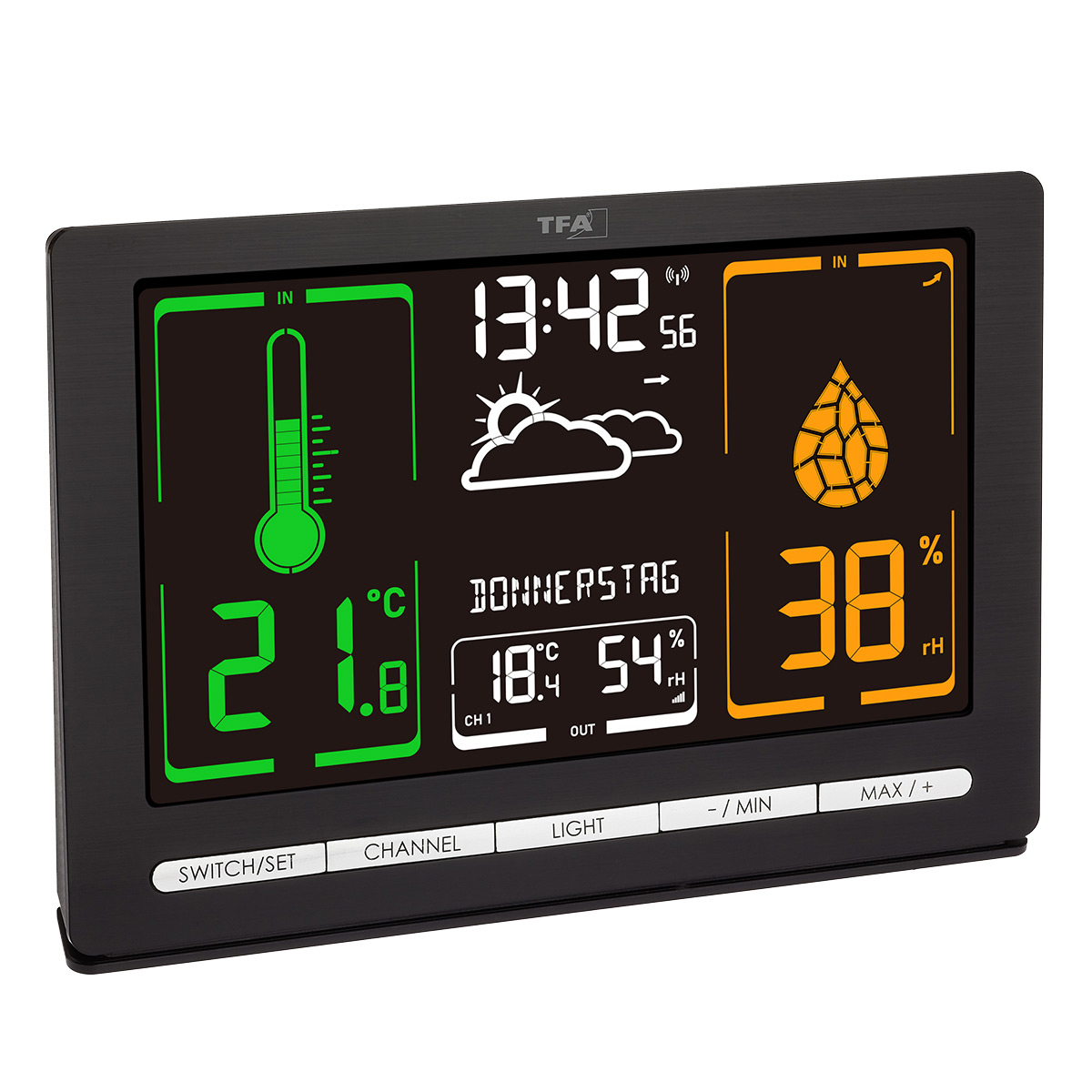 Спеціальний дисплей VA, що використовує технологію вертикального вирівнювання рідких кристалів, забезпечує кращу контрастність та насиченіші кольори на всіх чотирьох рівнях яскравості підсвітки, ніж звичайний рідкокристалічний дисплей. Корпус виготовлений з міцного матового пластику, що гарантує йому довговічність та стильність. Метеостанція TFA Meteochrome Black відмінно пасуватиме до інтер'єру будинку або офісу, встановлюється на столі або стіні.
