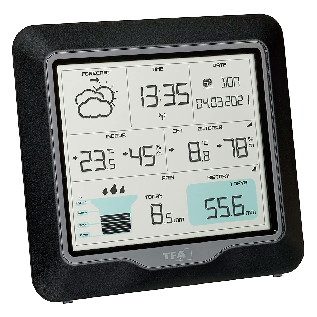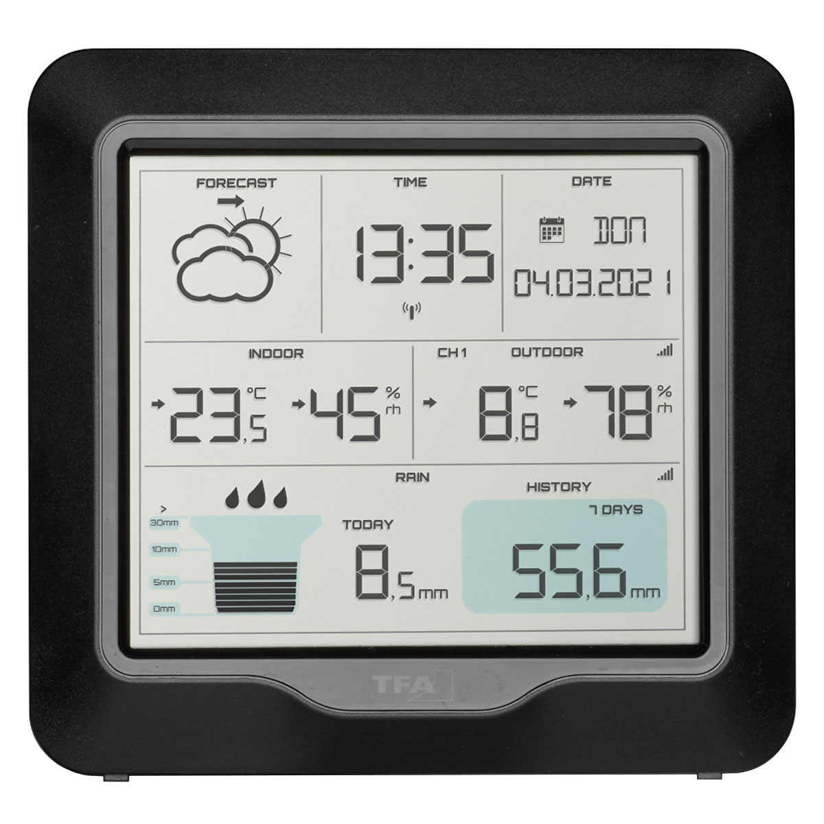 TFA RAIN PRO – це повноцінна бездротова метеостанція, яка розширена можливістю вимірювання опадів завдяки спеціальному виносному датчику-контейнеру. Також до комплекту входить другий комбінований датчик з невеликим монохромним екраном для визначення зовнішньої температури та вологості. Можливе розширення іншими датчиками (ще два датчики 30.3249.02).
