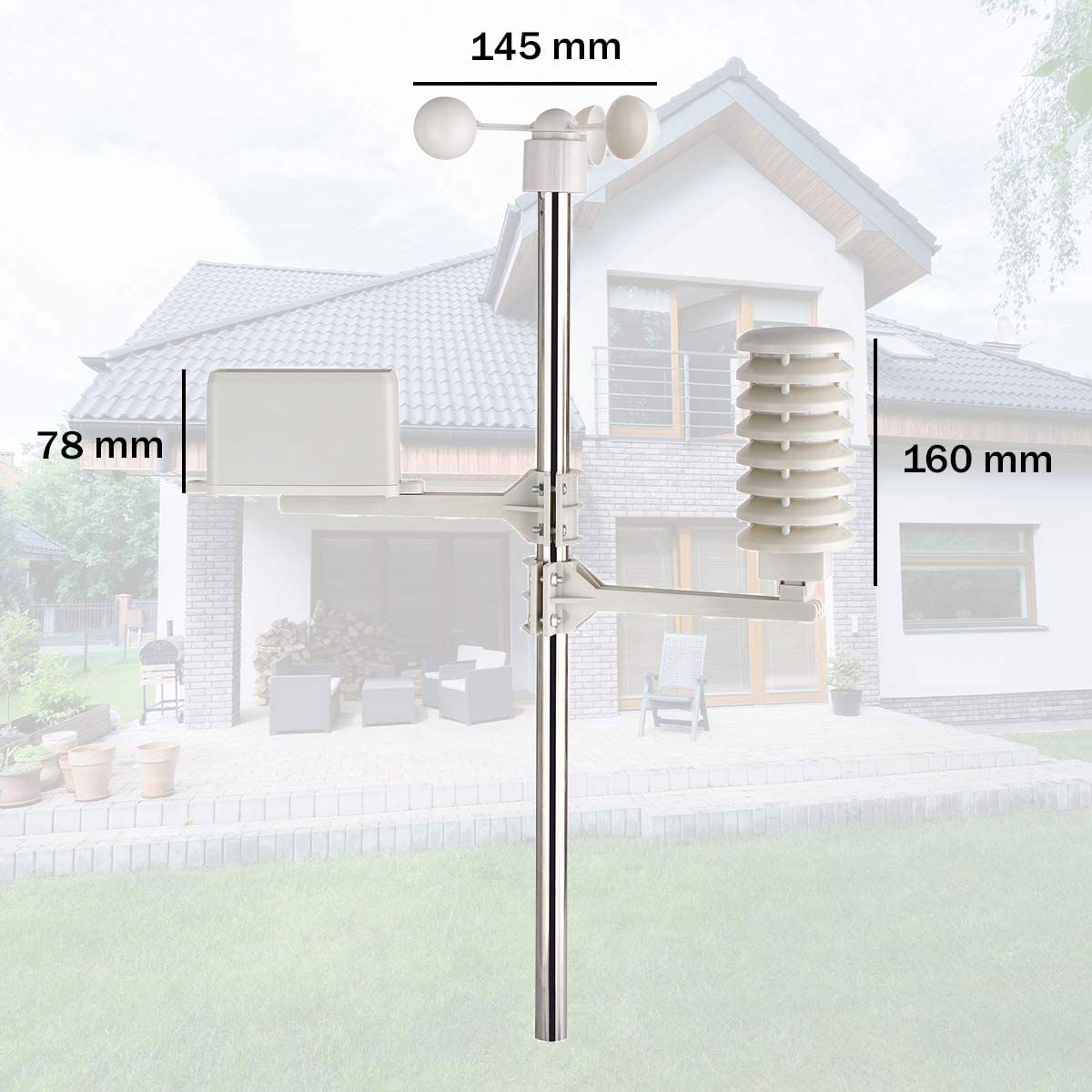 Домашня метеостанція TFA Stratos комплектується комбінованим зовнішнім датчиком, який складається з термогігрометра, анемометра та дощоміру. Метеостанція здатна виміряти температуру та відносну вологість повітря, рівень опадів, швидкість вітру, а також атмосферний тиск.