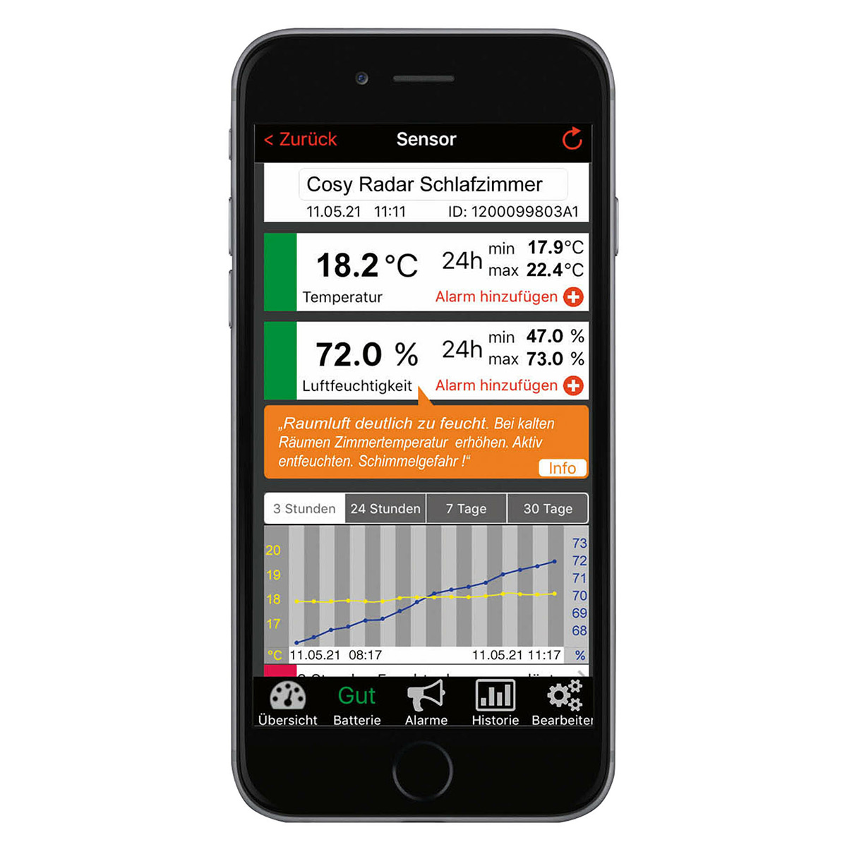 Термогігрометр Cosy Radar використовується для вимірювання температури та вологості у приміщенні, наприклад, в спальні, дитячій кімнаті, коморі або підвалі. Датчик одночасно вимірює зовнішню температуру та вологість. Обидва прилади передають дані до мобільного шлюзу, який в свою чергу надсилає їх на хмарний сервер. Отриману інформацію можна переглянути на екрані власного смартфона в будь-який час та у будь-якому місці з доступом до інтернету, попередньо встановивши безкоштовний мобільний додаток TFA WeatherHub.
