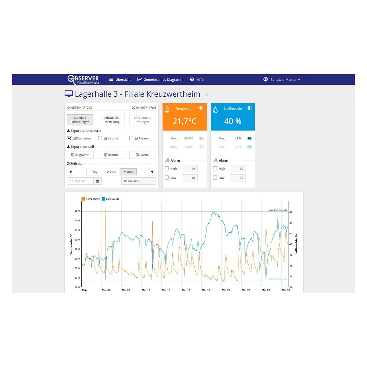 TFA WeatherHub Observer комплектується одним термо/гігро датчиком з додатковим дротовим сенсором, а також Інтернет-шлюзом, який потрібно під'єднати до Wi-Fi роутера. Моніторинг погодних даних доступний у мобільному додатку TFA WeatherHub або на веб-платформі WeatherHub Observer.