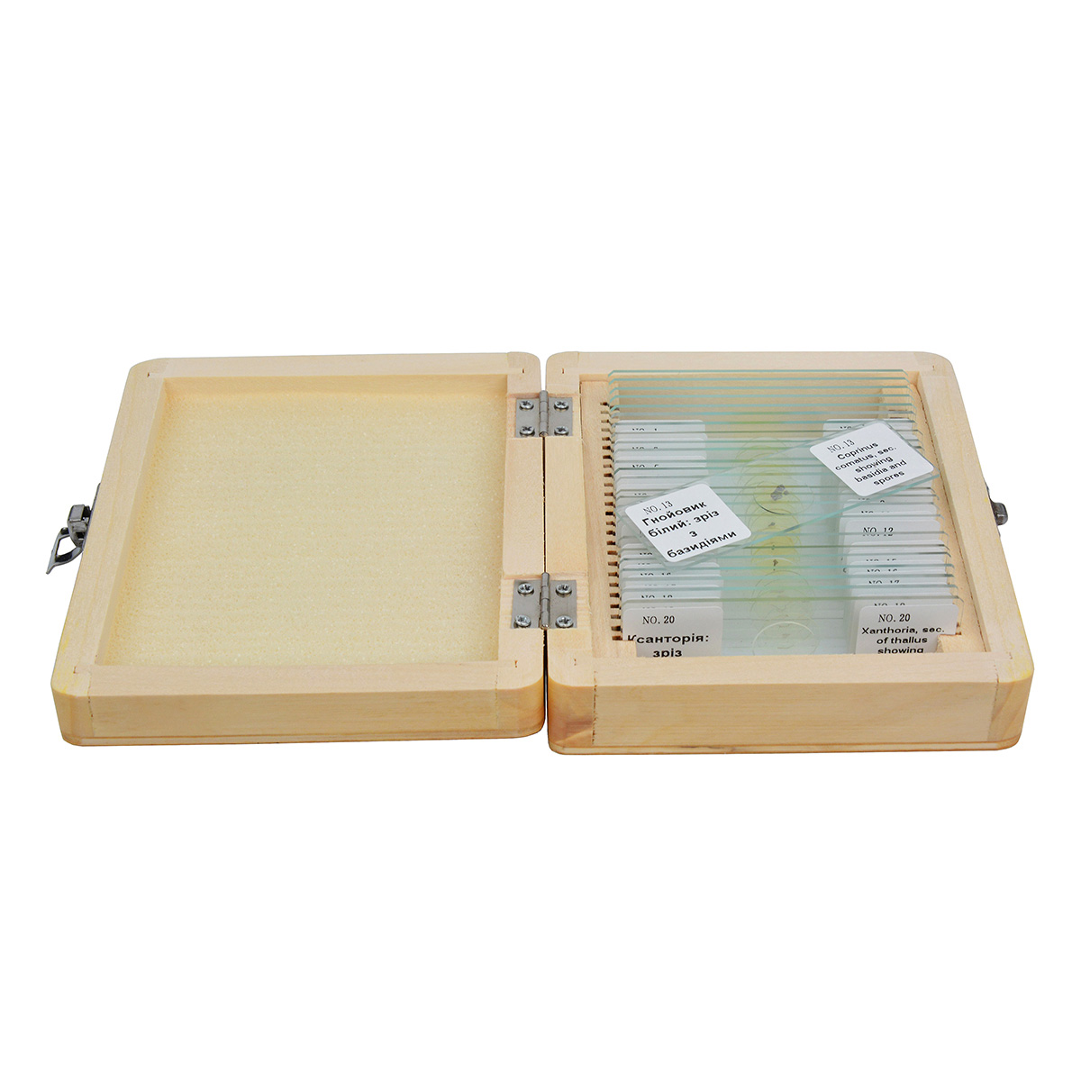 Набір упаковано в привабливу дерев'яну коробку з пазами для слайдів, яка захищає мікропрепарати від можливих пошкоджень під час зберігання або транспортування. Термін зберігання слайдів не обмежений, препарати очищені від сторонніх частинок, мають чіткі контури і придатні для вивчення за допомогою шкільних мікроскопів та луп.