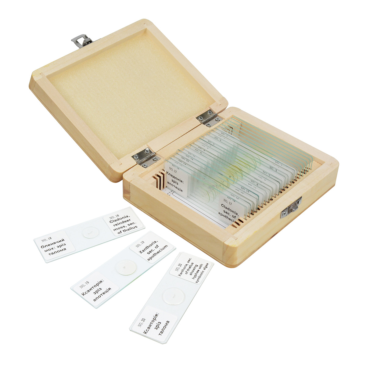 У наборі присутні слайди, що ілюструють будову різних організмів, таких як гриби, мохи, лишайники. Крім того, у коробці міститься по 5 порожніх предметних та покривних скелець для виготовлення додаткових слайдів.