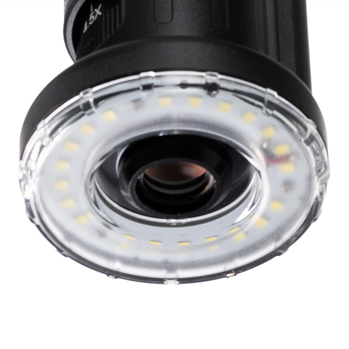 Мікроскоп оснащений двома системами підсвітки – верхньою та нижньою. Навколо об'єктива розташований кільцевий освітлювач із 21 світлодіодом, який забезпечує рівномірне відбивне освітлення непрозорих об’єктів та зменшує тіні й відблиски. Дослідження прозорих та напівпрозорих зразків здійснюється завдяки прохідному світлу нижньої підсвітки, інтегрованої в предметний столик. Користувач може регулювати інтенсивність верхньої та нижньої підсвітки у п'яти рівнях яскравості. Це дозволяє точно налаштувати освітлення відповідно до умов спостереження.