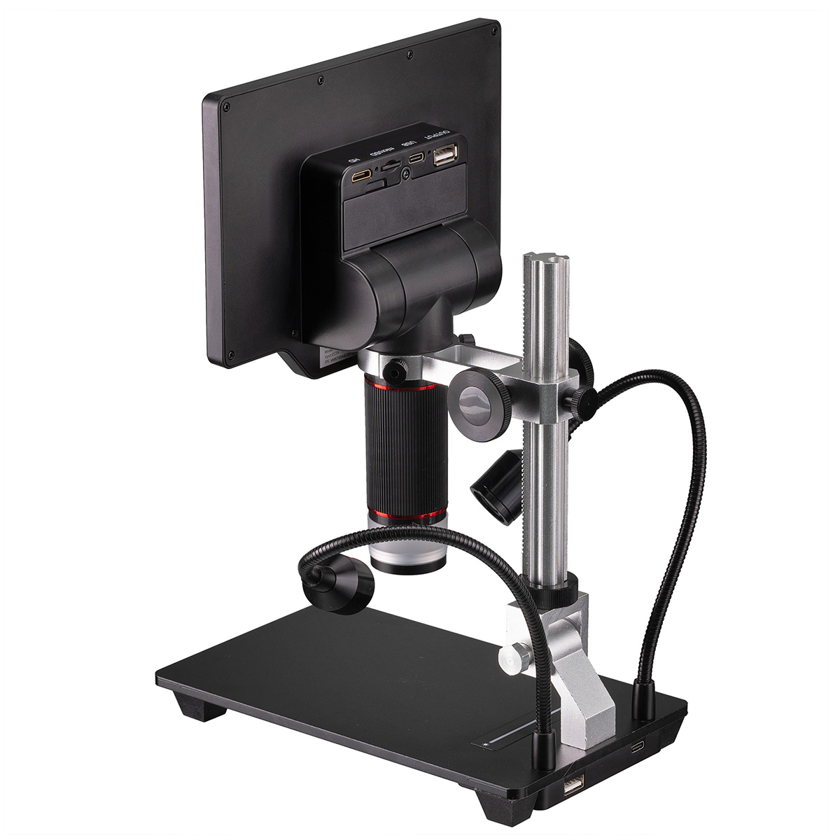Навколо об'єктива розміщено кільцевий освітлювач із 6 світлодіодів, який забезпечує рівномірне верхнє освітлення зразка та зменшує тіні й відблиски, що особливо важливо при дослідженні полірованих або рельєфних поверхонь. Додаткові два прожектори на гнучких тримачах дозволяють спрямовувати світло під різними кутами, що ефективно при роботі з об'єктами складної форми або для підкреслення рельєфу поверхні. Яскравість освітлення регулюється за допомогою сенсорних LED-панелей на корпусі екрана та предметному столику, що дозволяє точно налаштувати інтенсивність світла відповідно до умов спостереження.