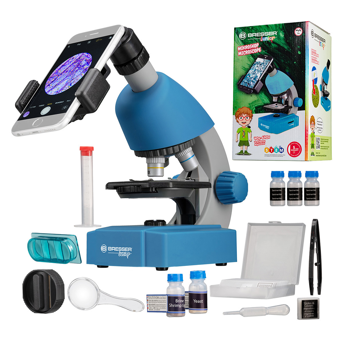Мікроскоп Bresser Junior 40x-640x Blue — сучасний дитячий мікроскоп від відомого німецького бренду Bresser, який призначений для самостійного вивчення мікросвіту молодшими школярами і "наукових" експериментів дошкільнят під керівництвом дорослих. Завдяки соковитому блакитному кольору і красивій упаковці стане відмінним подарунком до будь-якого свята.