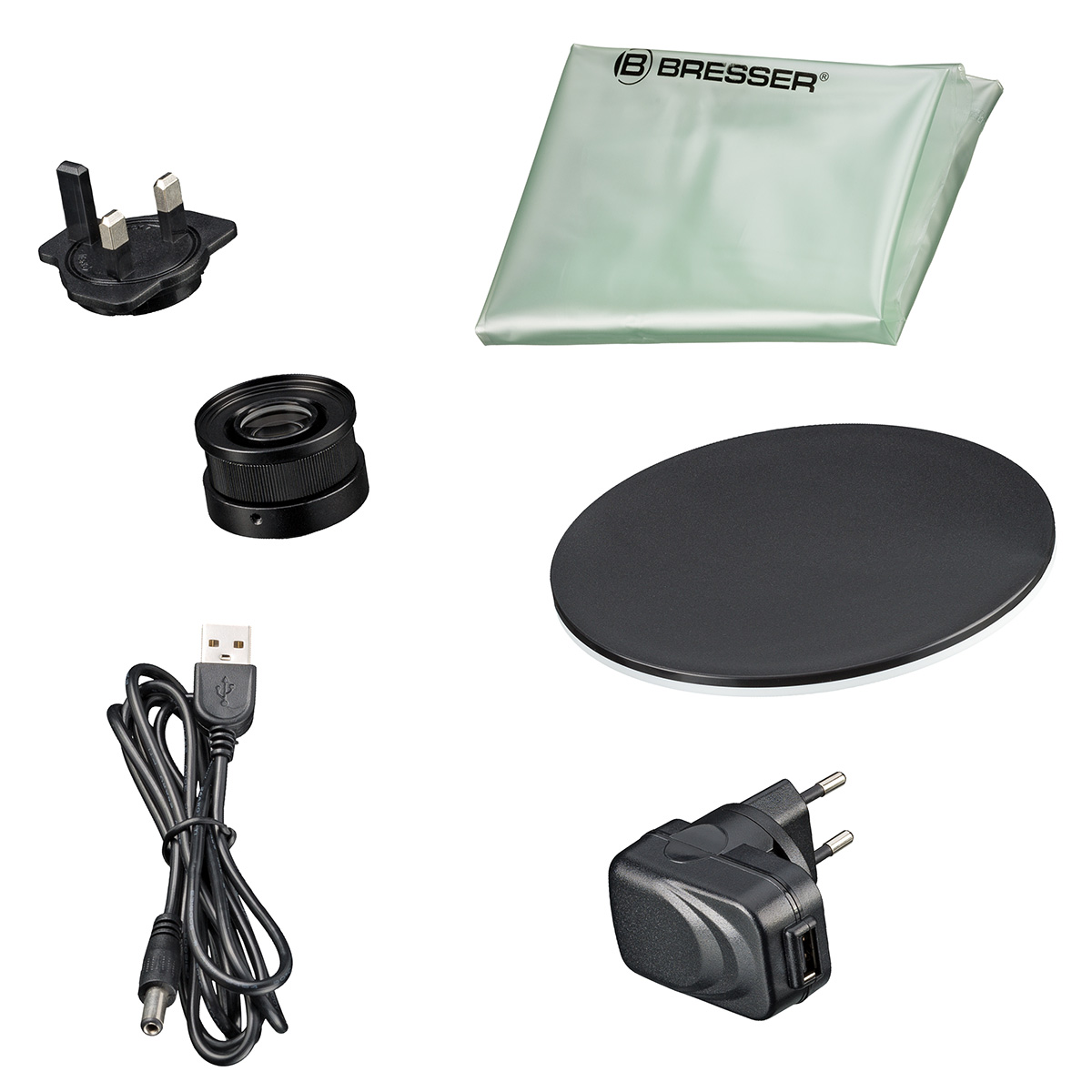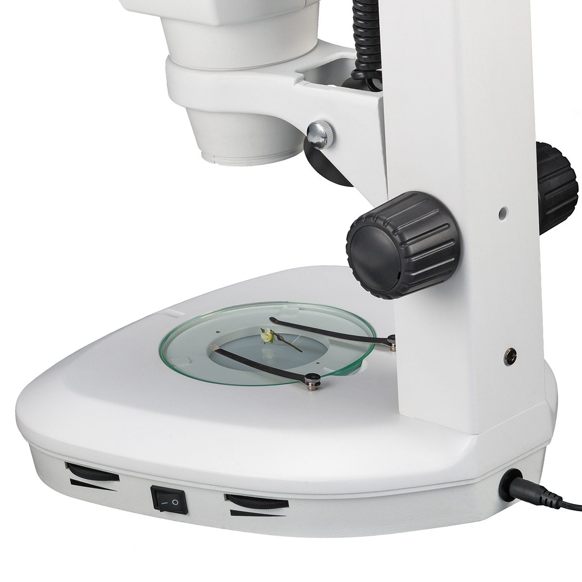 Підсвітка стереомікроскопа Bresser Science ETD-201 Stereo 8x-50x живиться від побутової електромережі 220 В або від комп'ютера через USB-порт. Фіксація об'єктів дослідження на предметному столі здійснюється за допомогою двох підпружинених затискачів. У комплектацію входять різні предметні диски, що дозволяють вивчати зразки на білому, чорному або матовому тлі.
