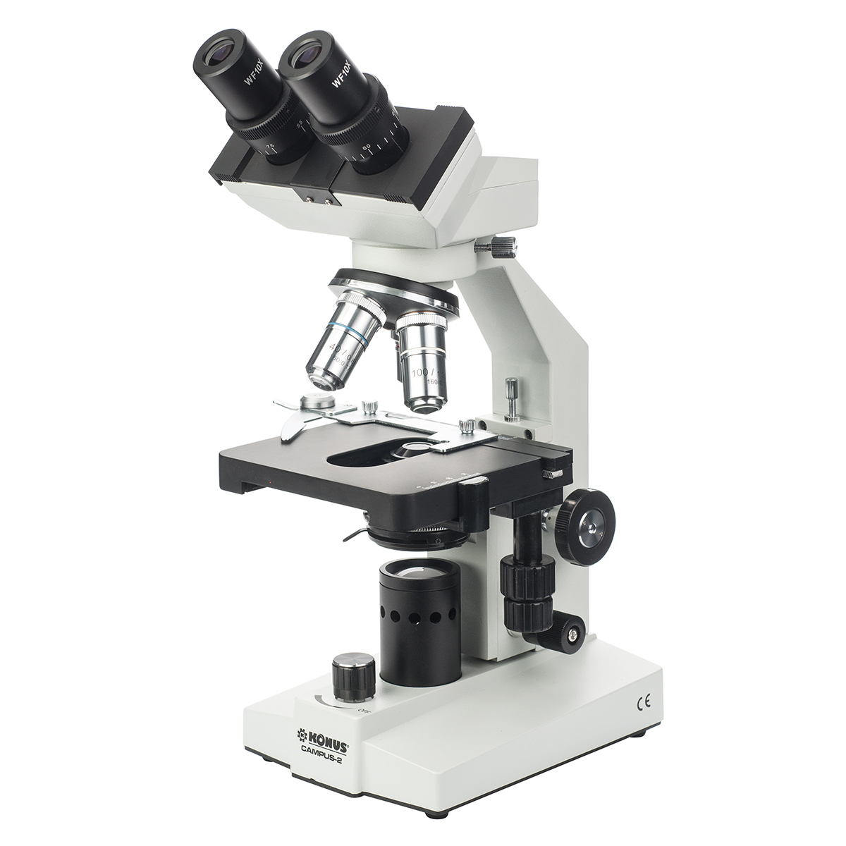 Бінокулярний мікроскоп KONUS Campus-2 — друге покоління популярної університетської моделі Konus Campus. Від попередника відрізняється більш економною LED-підсвіткою і потрійною системою живлення: від мережі, від акумуляторів або звичайних батарейок типу ААА. Оснащений комплектом парфокальних ахромат-об'єктивів і парою широкопольних окулярів з багатошаровим просвітленням основних поверхонь. Робоча кратність "з комплекту" — 40х, 100х, 400х при спостереженні сухим методом і 1000х при роботі з імерсією.