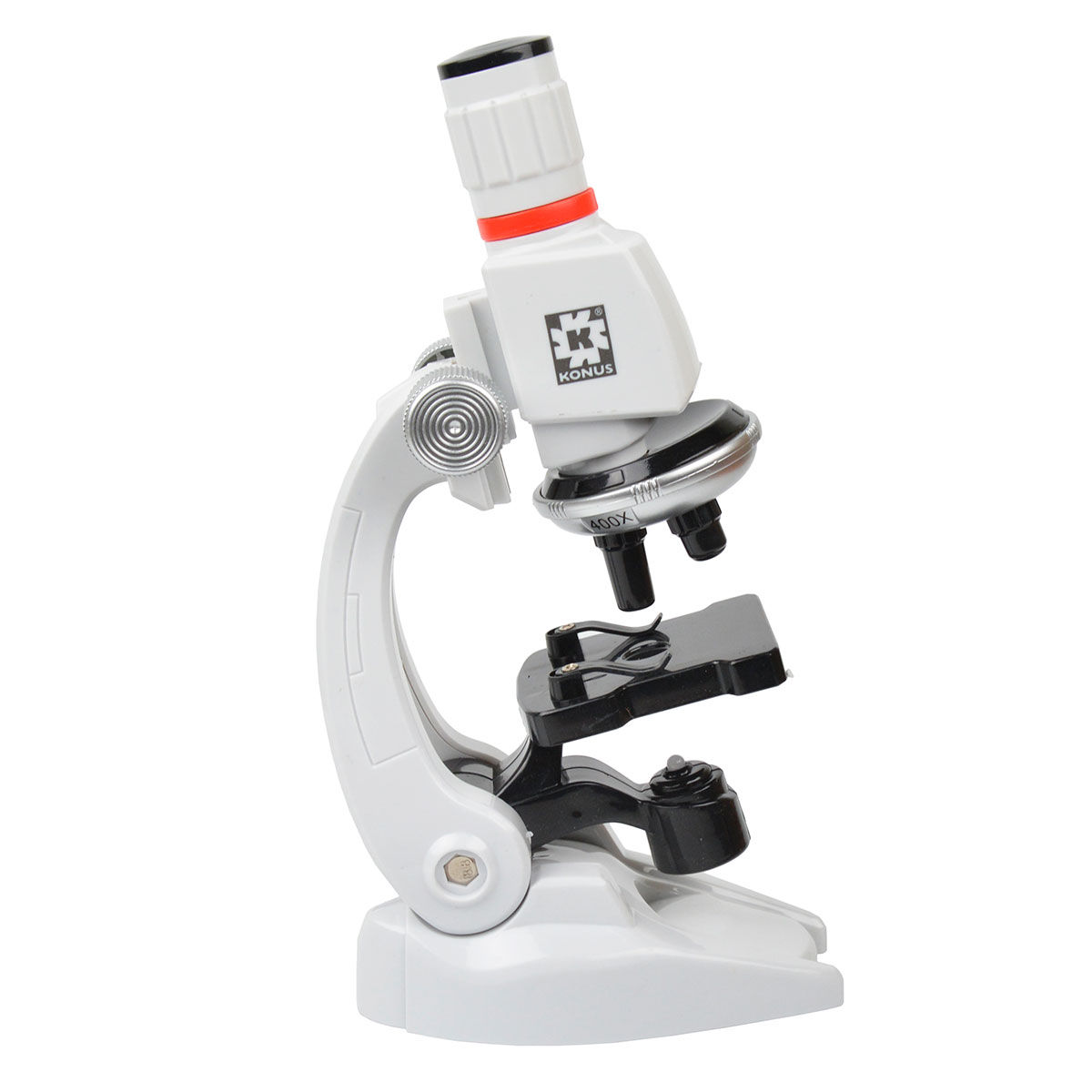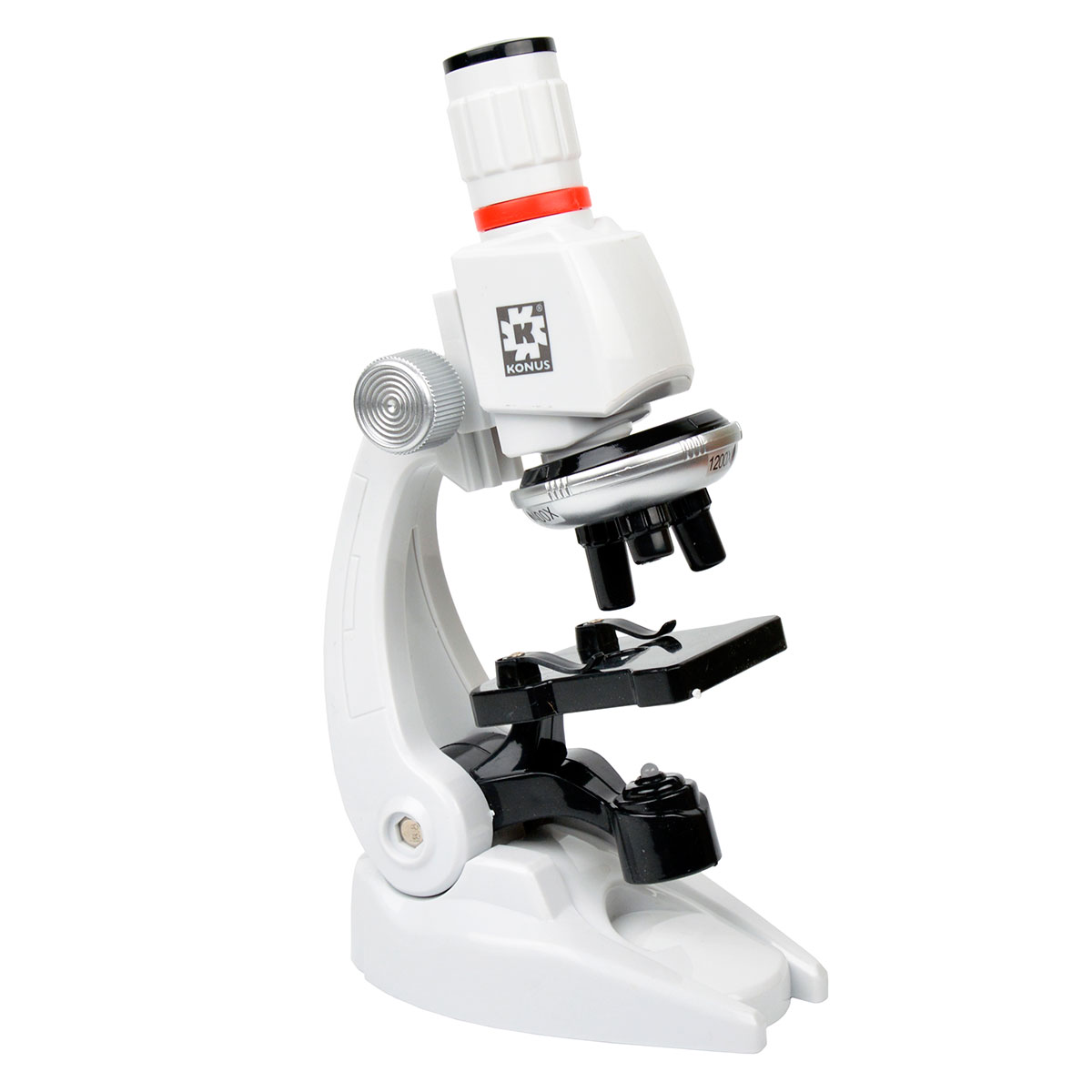Мікроскоп KONUS KONUSTUDY-5 має 10х окуляр, а також поворотну голову з трьома об'єктивами на 10х, 40х та 120х. Діапазон доступних збільшень дозволяє захопити все найцікавіше для дитини з мікросвіту. У комплект постачання включений один тестовий слайд з готовим зразком, щоб було легше освоїтися з керуванням і відразу приступити до вивчення.