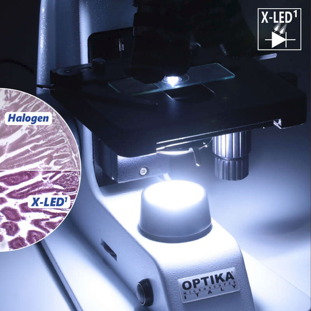 Optika B-159R-PL 40x-1000x Bino Rechargeable оснащений запатентованою розробкою предметного освітлення X-LED 1. Ексклюзивний дизайн лінз і колекторів забезпечує відмінну інтенсивність світла, чисто білу колірну температуру на всіх рівнях інтенсивності, а також точність передачі кольору. Також система освітлення відрізняється високою енергоефективністю і тривалим терміном служби світлодіодів — 50 000 годин.