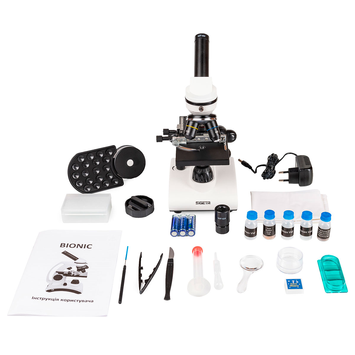SIGETA BIONIC 40x-640x — це шкільний (навчальний) біологічний мікроскоп з широким діапазоном збільшень, багатим функціоналом і продуманою комплектацією. Прекрасно підходить для вивчення мікросвіту і стане чудовим вибором для дітей шкільного віку і старше. У комплектацію входить вичерпний набір додаткових аксесуарів: адаптер для смартфона, інструменти для препарування, ємності для розведення, набір готових мікропрепаратів та порожніх скелець, що дозволить відразу ж почати експерименти і дослідження мікросвіту.
