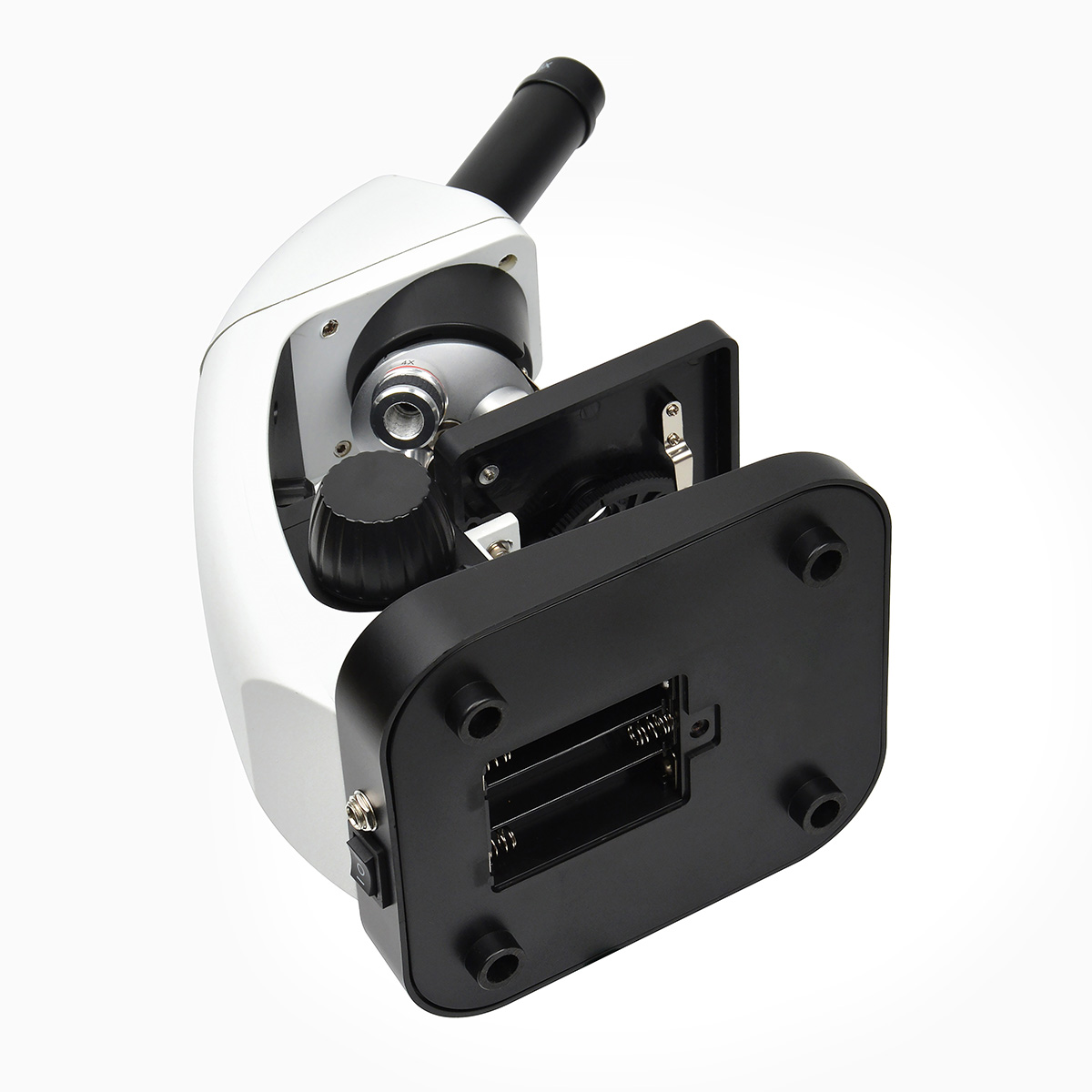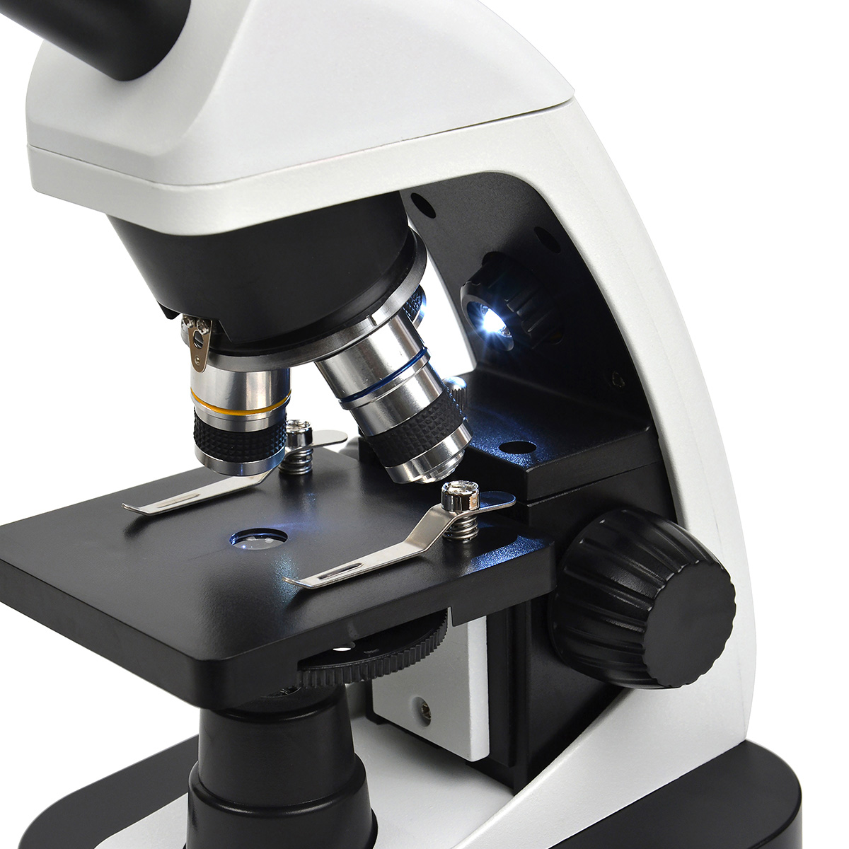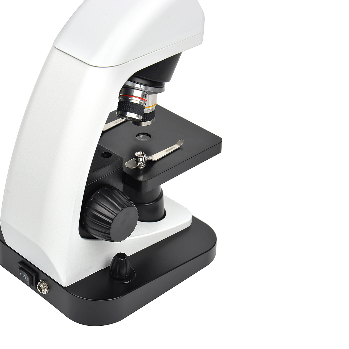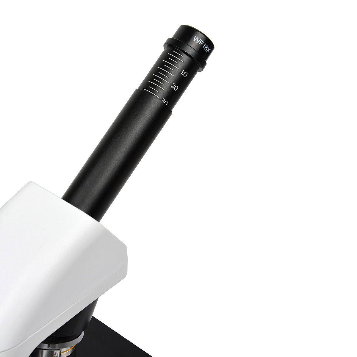 Корпус мікроскопа виготовлений із міцного пластику. Монокулярна насадка розташована під кутом 45°, що забезпечує зручне положення під час спостережень і знижує втому очей навіть при тривалій роботі. У комплекті передбачені ширококутні окуляри 10x і 16x, а також ахроматичні об'єктиви 4x, 10x і 40x, що дозволяє отримати збільшення в діапазоні від 40x до 640x. Шляхом додаткового використання висувної лінзи Барлоу 2x максимальне збільшення можна плавно підвищити до 1280x. Якісна оптика гарантує світле, чітке та контрастне зображення.