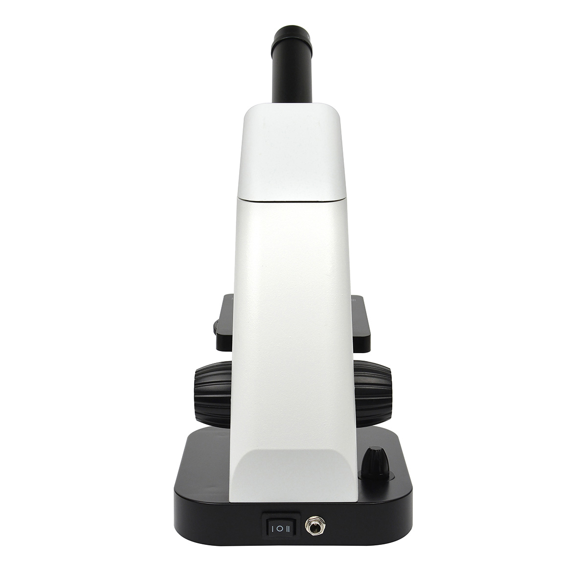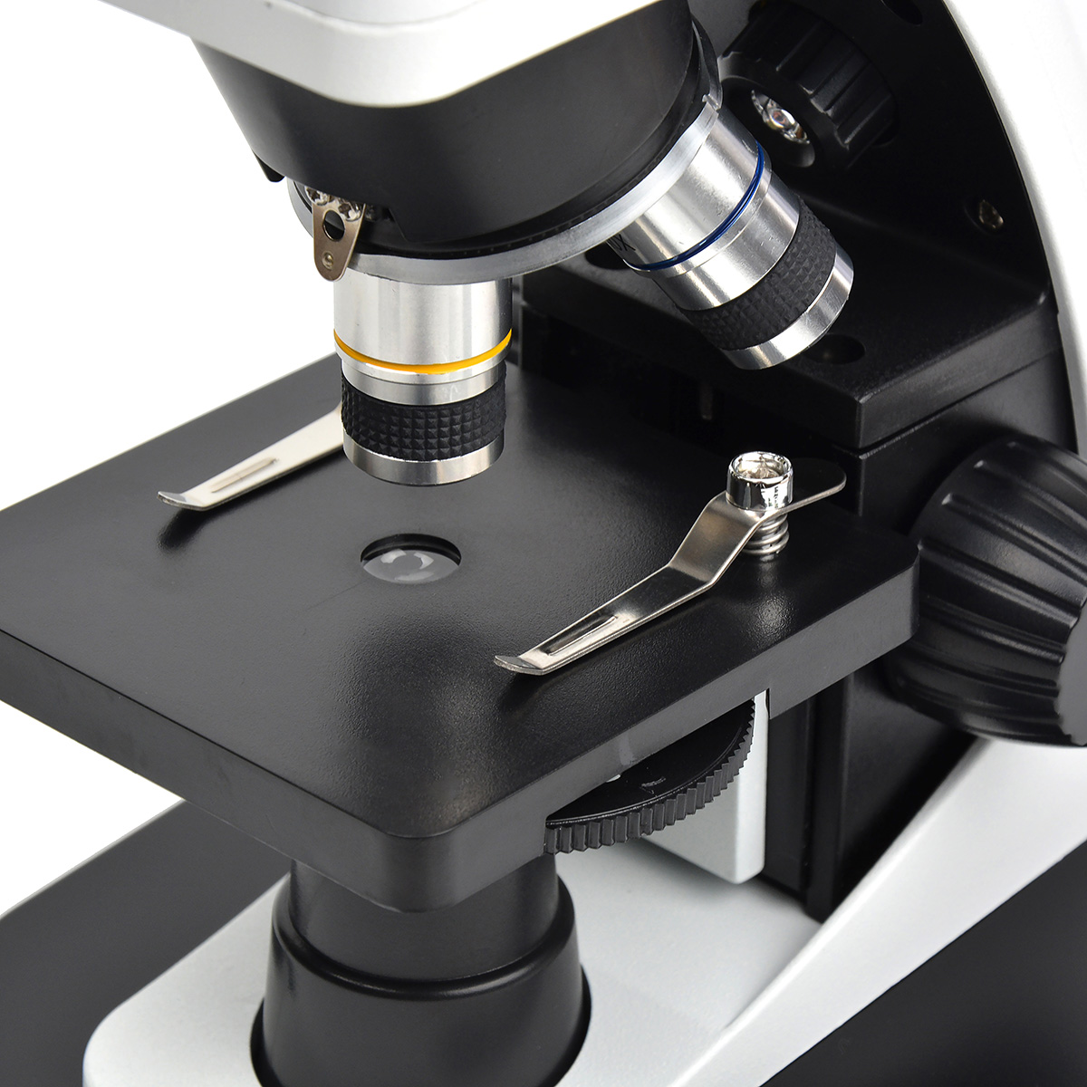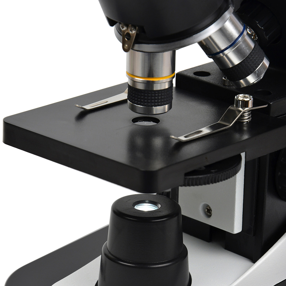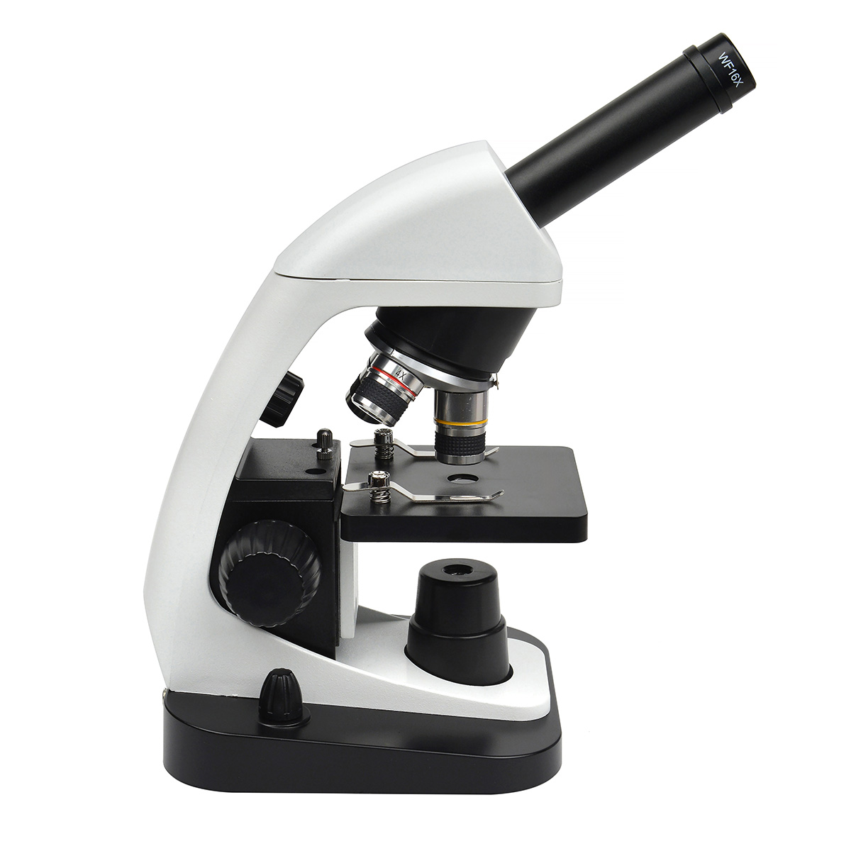 Корпус мікроскопа виготовлений із міцного пластику. Монокулярна насадка розташована під кутом 45°, що забезпечує зручне положення під час спостережень і знижує втому очей навіть при тривалій роботі. У комплекті передбачені ширококутні окуляри 10x і 16x, а також ахроматичні об'єктиви 4x, 10x і 40x, що дозволяє отримати збільшення в діапазоні від 40x до 640x. Шляхом додаткового використання висувної лінзи Барлоу 2x максимальне збільшення можна плавно підвищити до 1280x. Якісна оптика гарантує світле, чітке та контрастне зображення.
