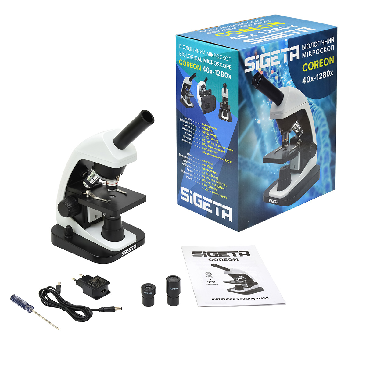 SIGETA COREON 40x-1280x LED Mono — високоякісний монокулярний біологічний мікроскоп із широкими можливостями. Ідеальний для навчання: підходить учням середніх та старших класів, студентам, вчителям та викладачам курсу біології, екології. Також стане у пригоді для самостійних досліджень і хобі, зокрема для перегляду біологічних зразків, монет, марок та інших дрібних предметів.
