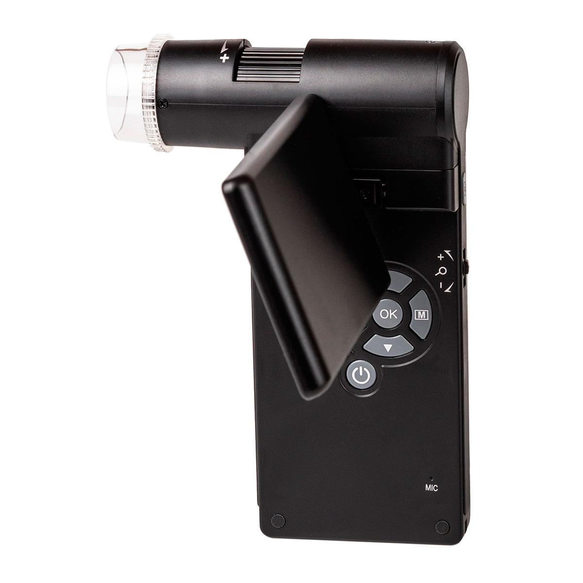 Мікроскоп пропонує широкий діапазон збільшення від 10х до 300х із можливістю додаткового використання цифрового зуму в межах 1х-4х. Роздільна здатність становить 5 MП, при цьому за необхідності доступна інтерполяція до 12 MП. Отримане кольорове зображення виводиться на 4-дюймовий рідкокристалічний екран з технологією IPS, положення якого можна налаштовувати для максимального комфорту. Прилад дозволяє не лише вести спостереження, а й знімати фото та записувати відео з додаванням закадрових голосових коментарів. Усі файли зберігаються на карті пам’яті microSD (не входить до комплекту постачання). Завдяки літій-іонному акумулятору ємністю 1050 мАг тривалість автономної роботи мікроскопа досягає 3 годин.