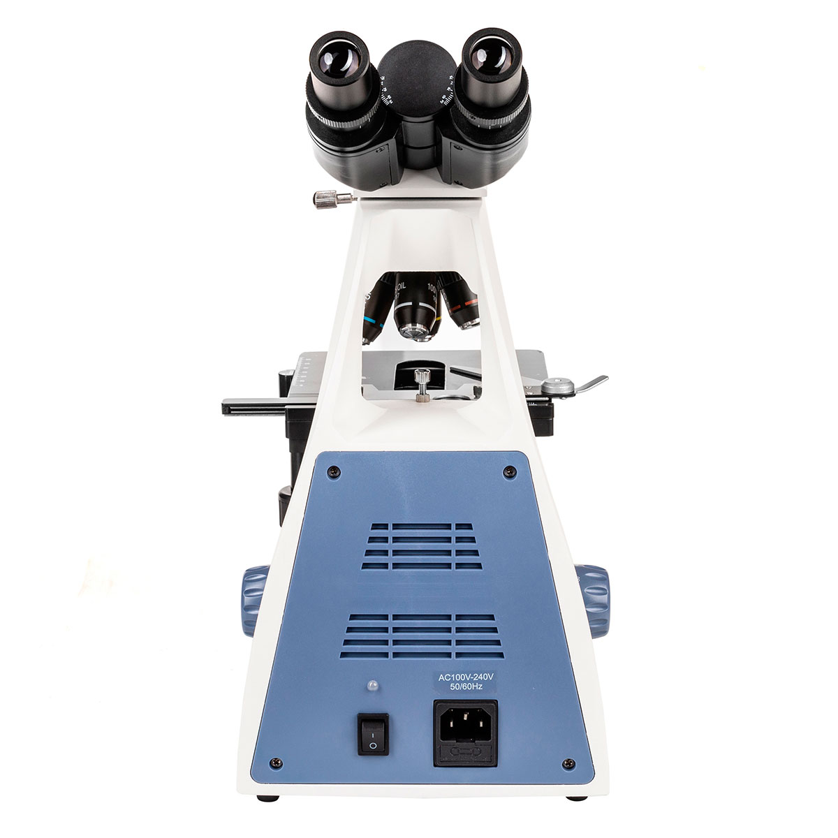 В основі мікроскопа лежить цільнолитий і дуже міцний металевий корпус. Тринокулярна голова комплектується чотирма окулярами з просвітлюючим покриттям на 10x і 16x, і може обертатися на 360 градусів. Для забезпечення комфортних умов спостереження окулярний тубус розташований під кутом 30° по відношенню до горизонтальної площини. Насадка револьверного типу оснащена чотирма об'єктивами з багатошаровим антигрибковим покриттям на 4x, 10x, 40x і 100x. Для кожного об'єктива є чітка фіксація, а обертати головку зручно навіть одним пальцем.