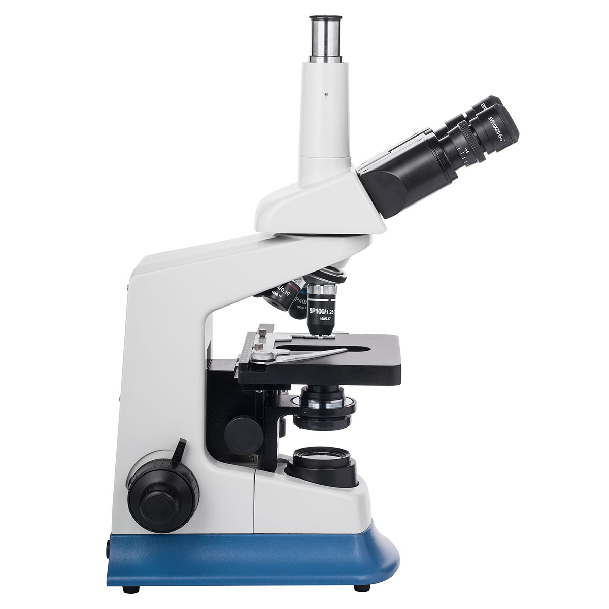 - Об'єктиви: напів-планахроматичні 4x, 10x, 40x(s), 100x(s, oil)