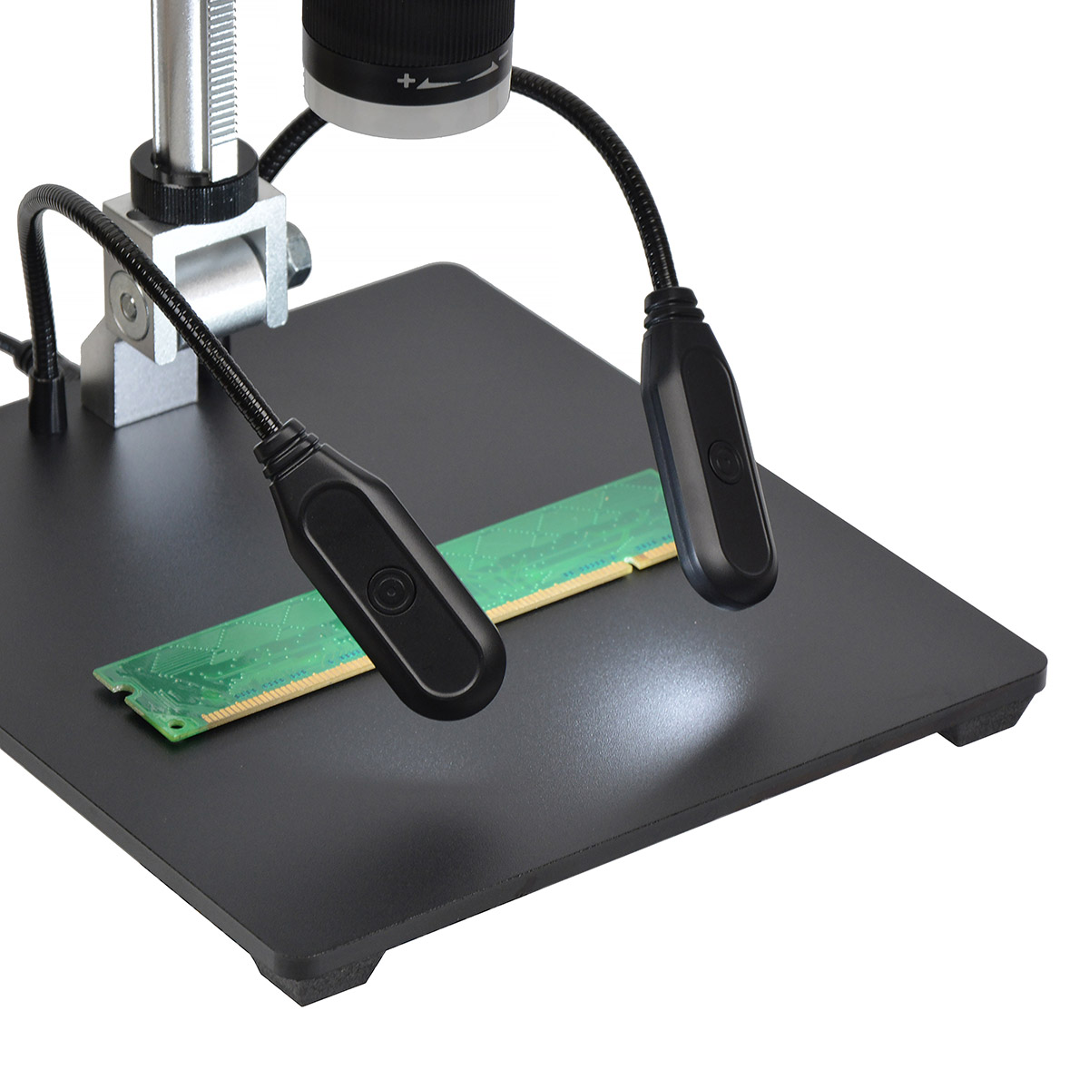 Навколо об'єктива зі змінною фокусною відстанню розміщено 8 світлодіодів з плавним регулюванням яскравості, які забезпечують рівномірне верхнє освітлення зразка за різних умов. Збільшення та фокусування налаштовуються за допомогою центрального колеса на об’єктиві та двосторонніх гвинтів на штативі. Їх текстурована поверхня забезпечує зручність обертання та запобігає зісковзуванню пальців. Для налаштування нижчого збільшення потрібно обертати гвинт за годинниковою стрілкою, а колесо — вправо. Щоб досягти вищого збільшення, варто обертати гвинт проти годинникової стрілки, а колесо — вліво.