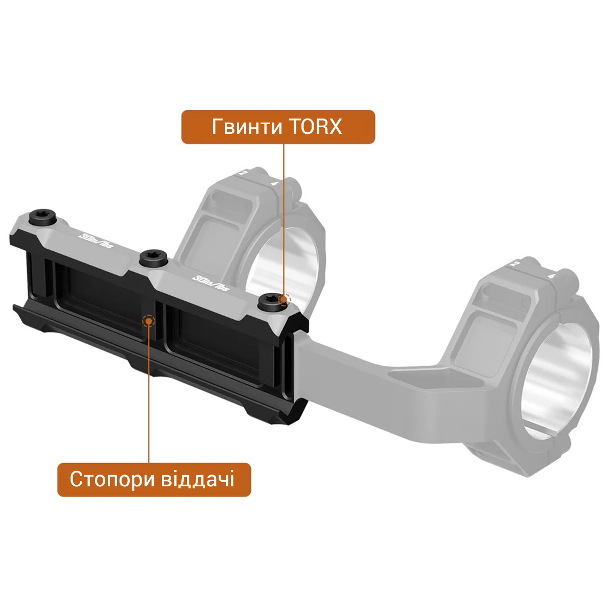 Конструкція передбачає винос у 51 мм, дозволяючи правильно позиціювати приціл відносно стрільця для досягнення зручного та стабільного виходу зіниці. Кріплення є постійним і надійно фіксується на стандартній планці Picatinny трьома гвинтами, гарантуючи жорстку посадку без зміщення навіть під час використання потужних калібрів. Для додаткової точності встановлення передбачені напрямні штифти, які підвищують стабільність конструкції та захищають від мікрозсувів. Окремо варто відзначити наявність міток на верхніх та нижніх напівкільцях, це значно спрощує процес вирівнювання прицілу під час монтажу. Завдяки цим рішенням користувач отримує максимальну зручність і впевненість у точності встановлення.