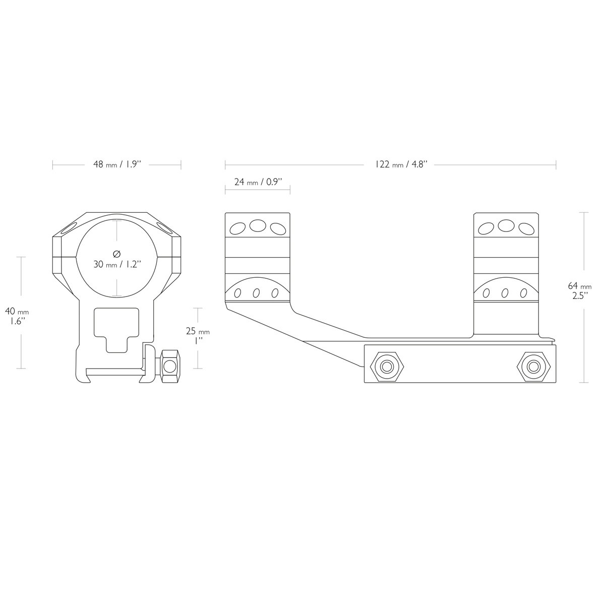 Приціл встановлюється на кільця діаметром 30 мм, які підходять для багатьох моделей, а високий профіль забезпечує комфортне прицілювання, особливо при використанні гвинтівок платформи AR. Винос 50 мм сприяє правильному розташуванню оптики, що покращує ергономіку стрільби та збільшує поле зору.