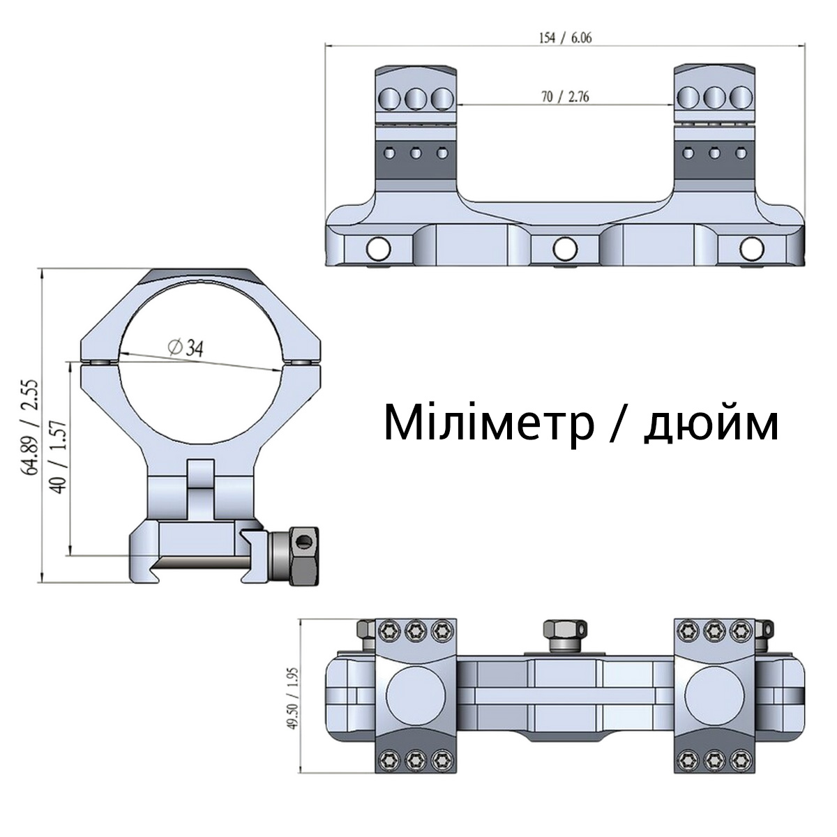 Приціл встановлюється на кільця діаметром 34 мм, які підходять для багатьох моделей, а високий профіль забезпечує комфортне прицілювання для прицілів з вихідною лінзою від 50 мм.