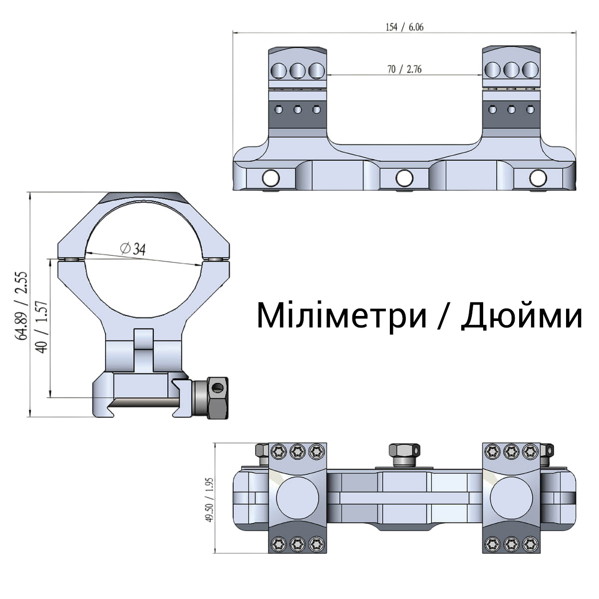 Кільця діаметром 34 мм з висотою до центру — 40 мм забезпечують оптимальне встановлення прицілів з великим об'єктивом — до 65 мм, не створюючи перешкод для поля зору або додаткового обладнання. Для максимального притиску та надійної фіксації кожне кільце оснащене шестигвинтовою системою кріплення, що рівномірно розподіляє тиск і мінімізує ризик пошкодження оптики.