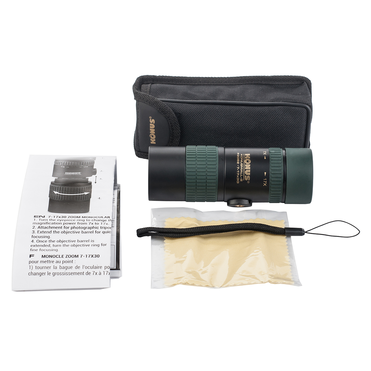 KONUS Konusmall-2 7-17x30 — компактний zoom-монокуляр з подвійною системою фокусування та роз'ємом для фотоштатива. При роботі на кратності до 10-12x установка приладу на штатив не потрібна, але на великих збільшеннях вона дозволить стабілізувати зображення, що тремтить через вібрацію рук.