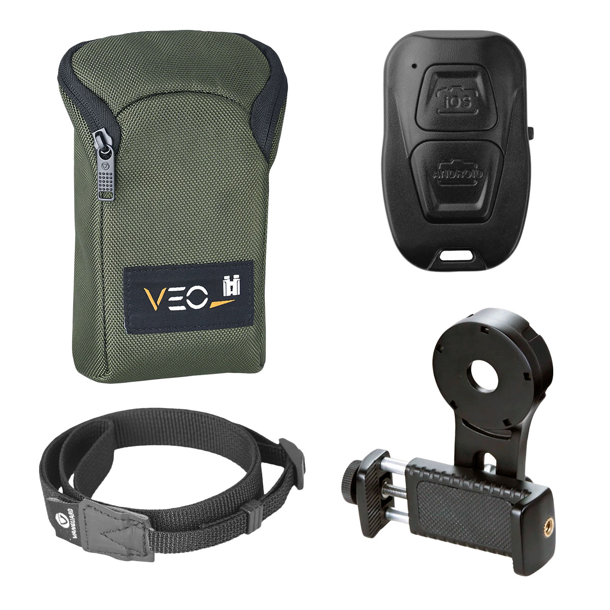 У комплект постачання входить адаптер PA-62 (ширина 50-90 мм), за допомогою якого до монокуляра можна підключити будь-який сучасний смартфон. Також разом з Vanguard VEO ED 8x42 WP йде пульт дистанційного управління, який працює з девайсами на iOS та Android через Bluetooth.