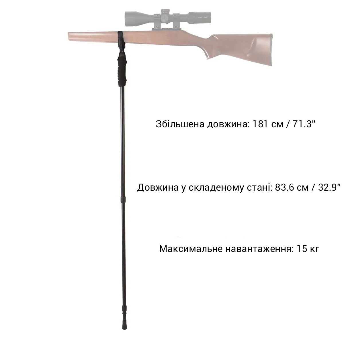 Довжина приладу регулюється в значному діапазоні від 84 см у складеному стані до 181 см у повністю розкладеному, це дозволяє використовувати його як сидячи або з коліна, так і стоячи. При цьому вага пристрою складає всього 380 грамів, що робить його надзвичайно зручним для тривалого носіння. Фіксація секцій здійснюється за допомогою швидких та надійних затискачів цангового типу, які дозволяють миттєво налаштувати необхідну висоту однією рукою. Кріплення зброї здійснюється на U-подібну опору, яка може контактувати як з дулом, так і з цівкою гвинтівки.