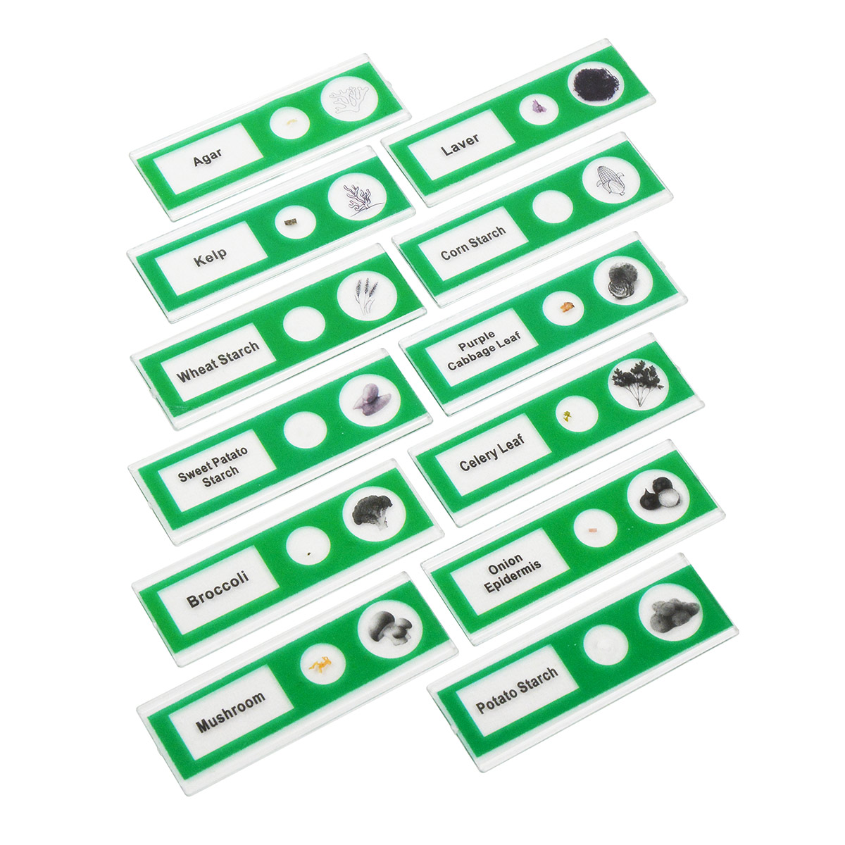 На слайдах містяться різні зрізи рослин, як знайомих нам з дитинства, так і екзотичних. Зразки очищені від сторонніх частинок, мають чіткі обриси і розміщені на небитких пластинах з прозорого пластику. Кожен слайд має підпис (англійською мовою) та малюнок-піктограму із зображенням предмета дослідження. Картонна коробка, в яку упакований набір, додає зручності при зберіганні та транспортуванні.