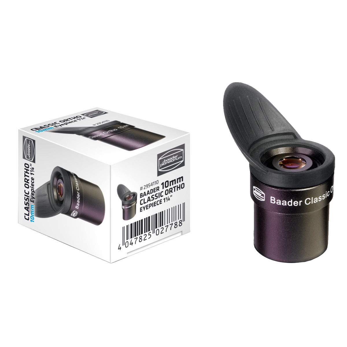 Baader Planetarium Classic Ortho 10 мм, 52°,1.25" виготовлений з міцного металу та доповнений гумовим крилатим наочником для комфортного спостереження. Аксесуар має стандартний посадковий діаметр 1.25", що робить його сумісним з більшістю телескопів. Він також оснащений внутрішньою різьбою для встановлення світлофільтрів. Дана модель (як і інші з цієї серії) є парфокальною, тобто при зміні окуляра не потрібно робити перефокусування.