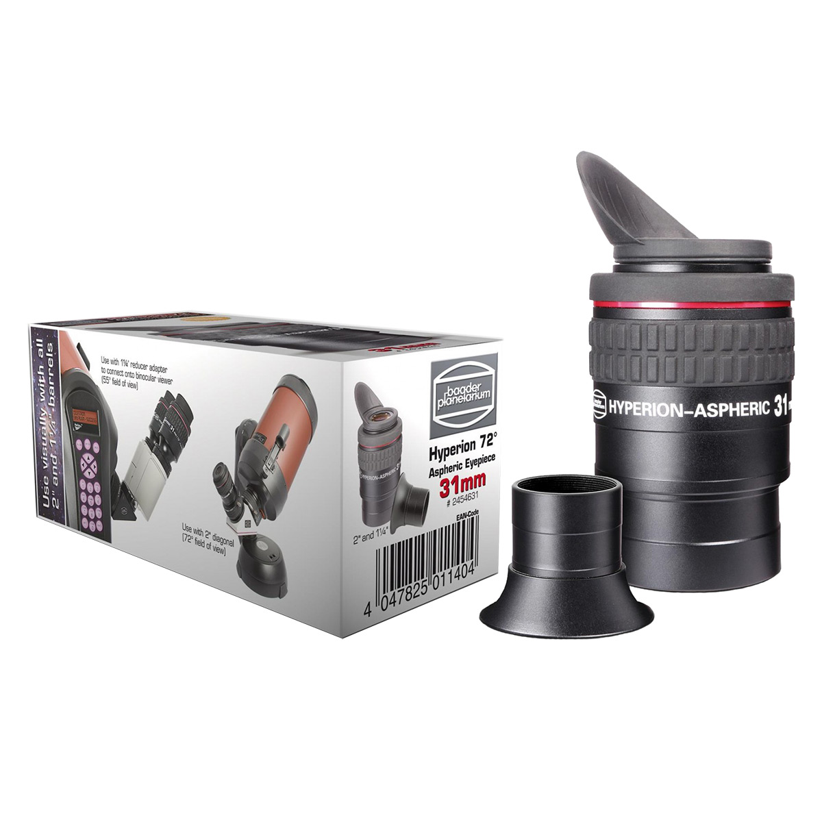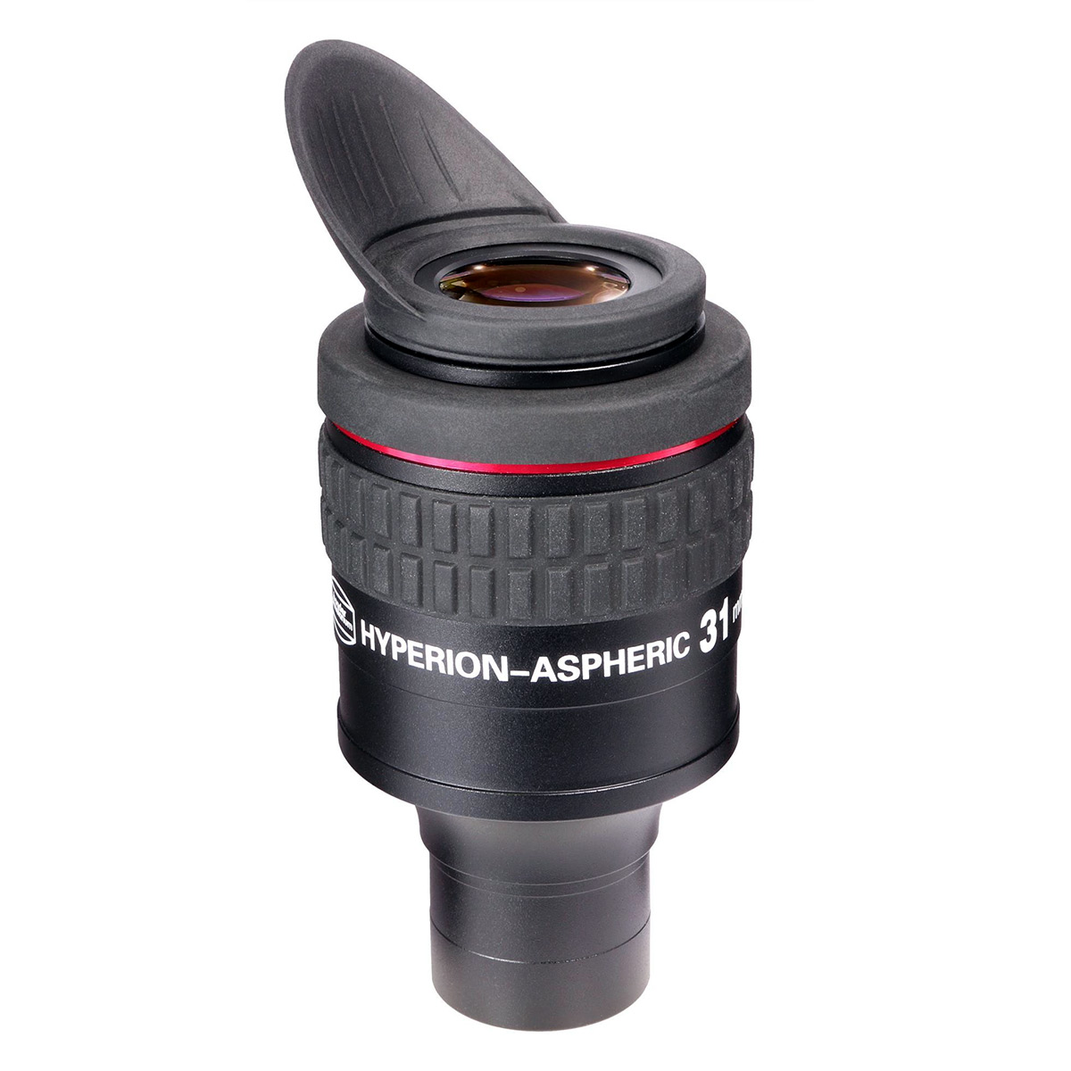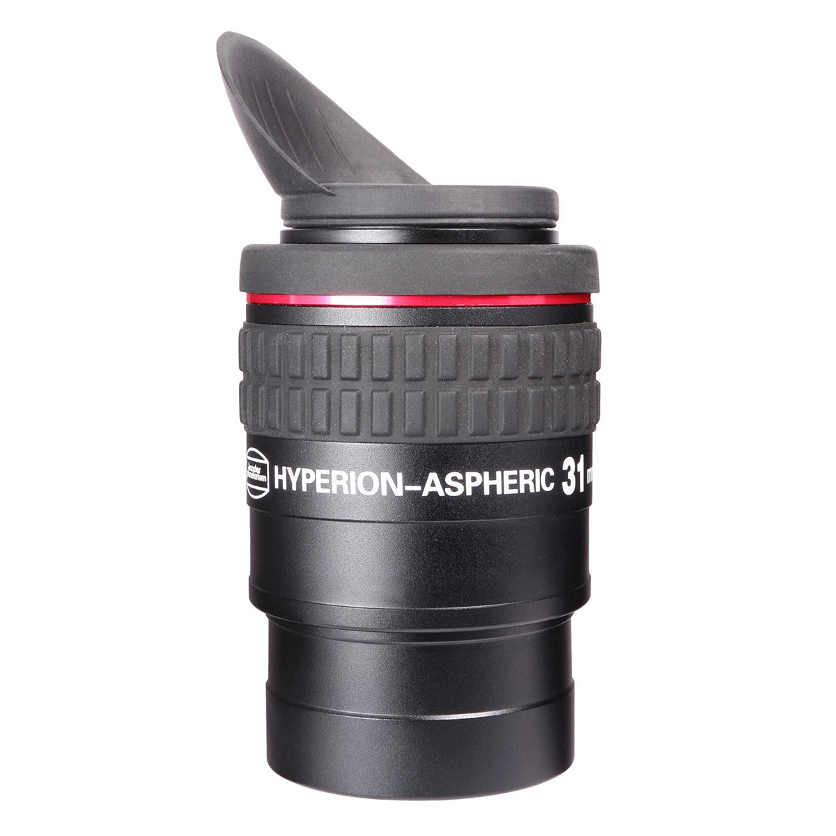 Окуляр Baader Planetarium Hyperion Aspheric 31 мм, 72° має модульну конструкцію та перехідник у комплекті, що дозволяє йому працювати як з 1.25", так і з 2" фокусерами. Аксесуар оснащений гумовим крилатим наочником, який захищає від стороннього світла та допомагає чіткіше бачити при спостереженні. Наочник можна повністю зняти, щоб відкрити доступ до різьби M43 і SP54. Це дозволяє приєднувати адаптери для прямого підключення цифрових камер, що забезпечує якісну астрофотографію.
