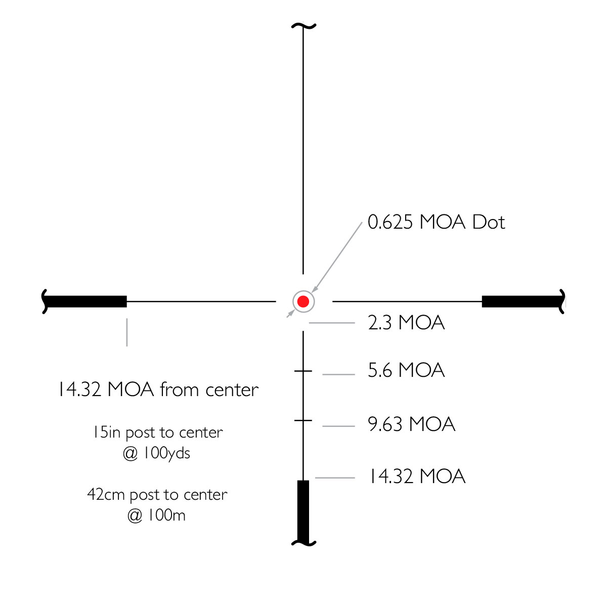 - Ціна поділки механізму введення поправок: 1/4 MOA