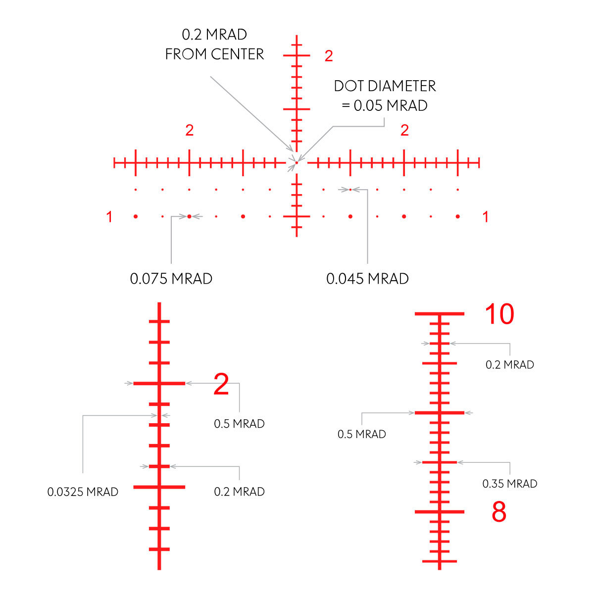 - Ціна поділки механізму введення поправок: 1/10 MRAD