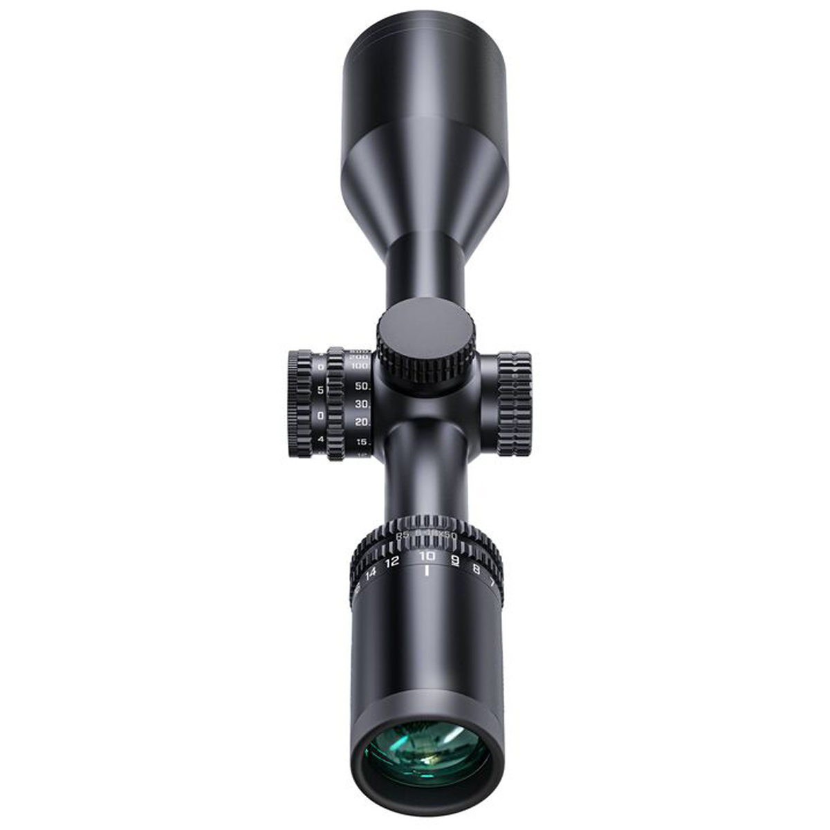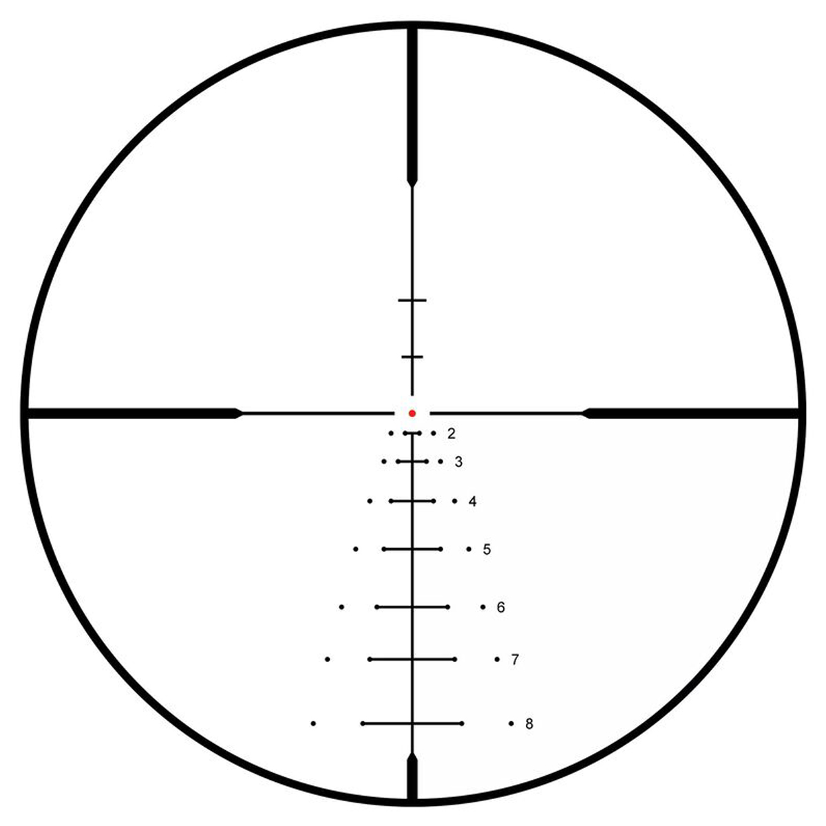 Прицільна балістична сітка DOA-LRH800 (Dead On Accurate - Long Range Hunter 800) розташована у другій фокальній площині (SFP), що означає збереження її візуального розміру при зміні кратності. Вона має систему міток для компенсації падіння кулі на дистанціях до 800 ярдів, дозволяючи робити швидкі та точні постріли без необхідності використовувати барабани поправок. Наявність підсвічування центральної точки та основних елементів сітки значно підвищує її ефективність на світанку або в сутінках, коли дичина найбільш активна. Комфорт та безпеку стрільця забезпечує велике віддалення вихідної зіниці — 102 мм. Діаметр вихідної зіниці змінюється від 8.3 мм до 2.75 мм, гарантуючи легкість прицілювання. Кутове поле зору становить 3.44-1.14° (або 6-2 метри на 100 м), що є чудовим показником для прицілу з таким збільшенням. Механізм введення поправок має ціну кліку 1/4 MOA, дозволяючи виконувати дуже точне пристрілювання. Загальний діапазон регулювань по вертикалі та горизонталі складає 50 MOA, а самі турелі є закритими, це надійно захищає налаштування від випадкових збоїв під час транспортування чи активного пересування.