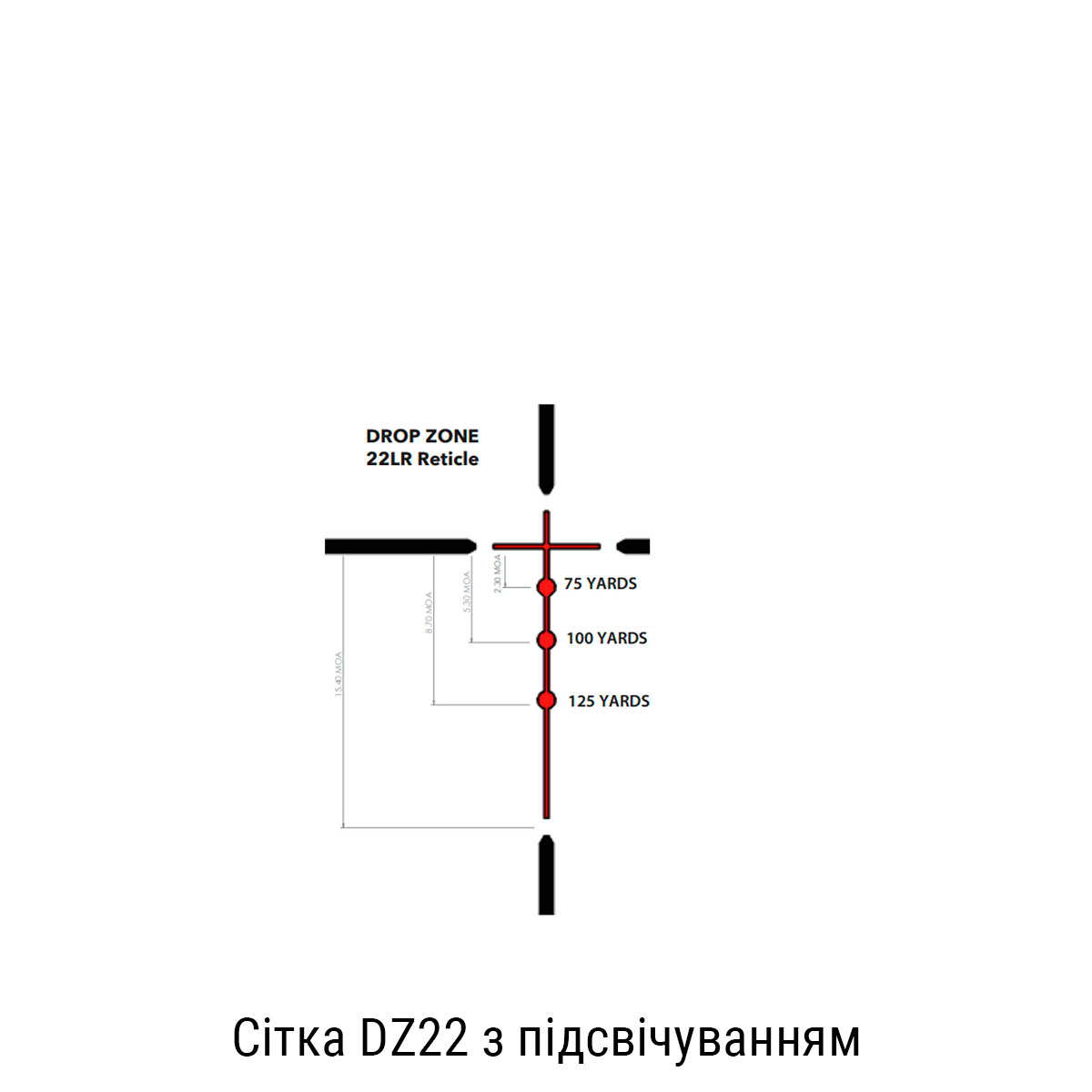 Балістична прицільна сітка Dropzone 22 з підсвічуванням розташована у другій фокальній площині та розмічена під патрон .22 LR з кулею масою 40 гран. Після пристрілювання на дистанцію 50 ярдів (45.7 м) розмітка прицільної сітки дозволяє легко визначити траєкторію польоту кулі на відстані до 125 ярдів (114 м).