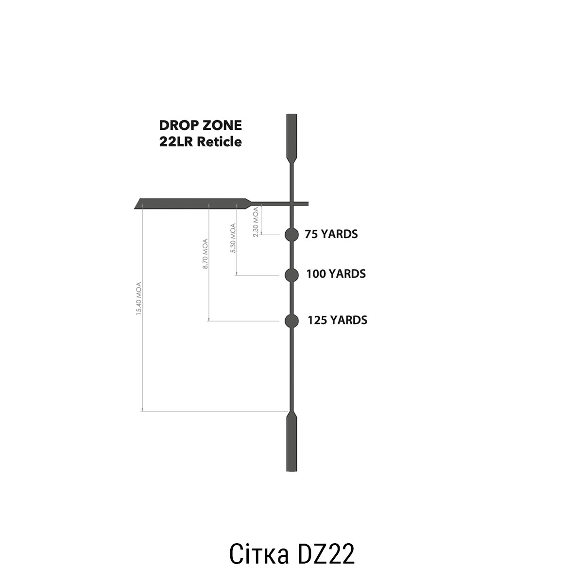 Балістична прицільна сітка Dropzone 22 розташована у другій фокальній площині та розмічена під патрон .22 LR з кулею масою 40 гран. Після пристрілювання на дистанцію 50 ярдів (45.7 м) розмітка прицільної сітки дозволяє легко визначити траєкторію польоту кулі на відстані до 125 ярдів (114 м).
