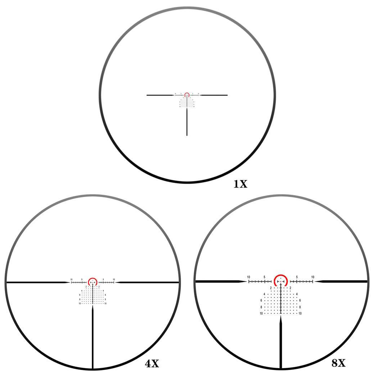 Приціл оснащений практичною та ефективною прицільною сіткою типу Circle-Dot, яка витравлена на склі для максимальної надійності. Ця сітка підходить для динамічної стрільби: велике коло забезпечує надзвичайно швидке захоплення цілі на 1x кратності, в той час, як центральне напівколо дозволяє здійснювати точні постріли на більших дистанціях. Для покращення видимості прицільної марки в складних умовах освітлення або на темному тлі передбачене 6-рівневе підсвічування червоного кольору. Це дозволяє стрільцю миттєво адаптуватися до будь-якої ситуації, від яскравого сонячного дня до сутінків, завжди зберігаючи чіткий контроль над точкою прицілювання.