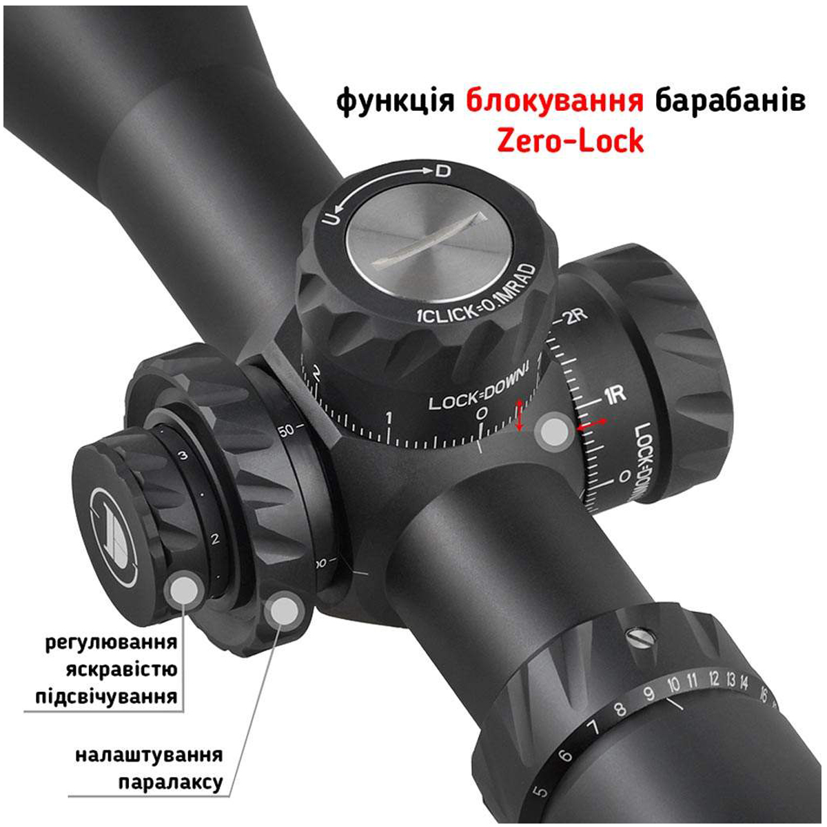 Приціл оснащений складною тактичною сіткою SLT FFP IR, витравленою на склі для максимальної надійності. Її продуманий дизайн з деталізованою розміткою дозволяє стрільцю швидко та точно вносити поправки на дальність та вітер, використовуючи елементи сітки. Для покращення видимості прицільної марки на темному тлі або в сутінках передбачене 6-рівневе підсвічування червоного кольору. Механізм введення поправок має такий набір функцій: Zero Lock надійно фіксує барабани, запобігаючи випадковим зміщенням та Zero Reset дозволяє легко скинути покажчики барабанів на "0" після пристрілки. Цей комплекс функцій надає стрільцю максимальний контроль та впевненість у своєму обладнанні.