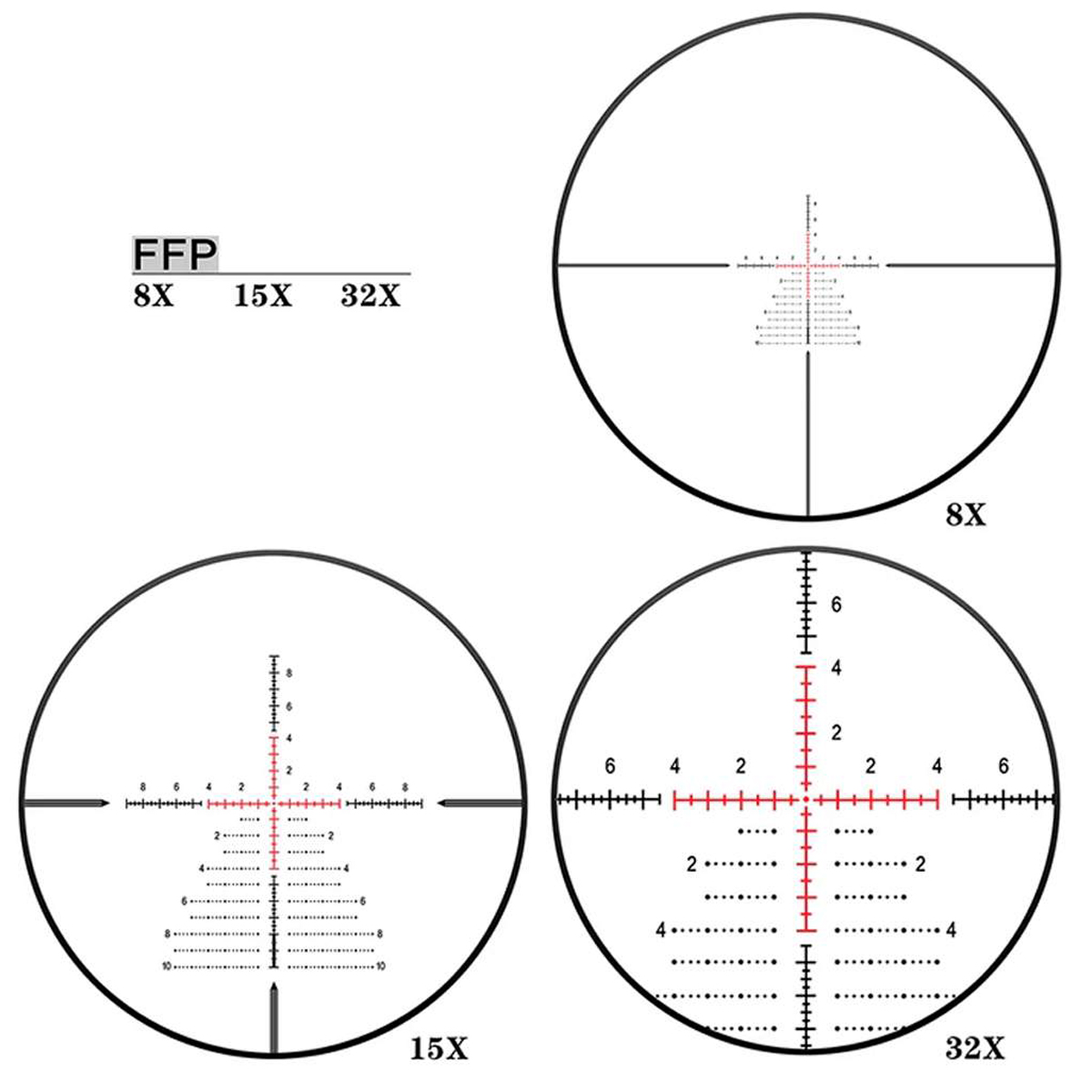 - Фокальна площина прицільної сітки: перша (FFP)