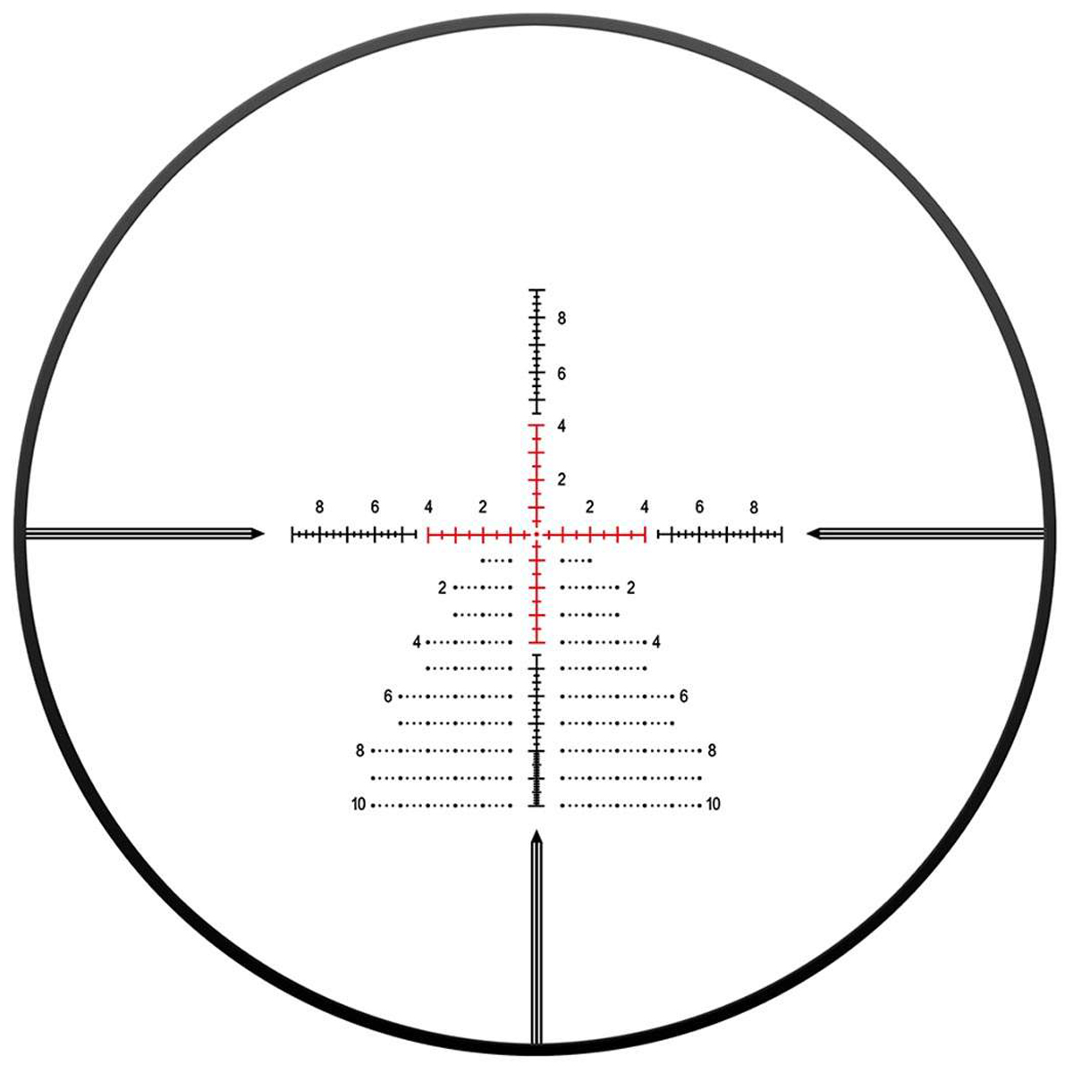 Сітка FFP-Z, розташована у першій фокальній площині (FFP), зберігає точні кутові пропорції незалежно від кратності, що дає змогу ефективно вносити поправки та проводити дальномірні розрахунки без перерахунків. Побудована на основі класичної Mil-dot, вона має повністю метричну шкалу в мілірадіанах (MRAD), що значно спрощує балістику та корекції. Система підсвічування центральної частини сітки червоного кольору з шестиступеневим регулюванням яскравості дозволяє стрільцю адаптувати зображення до умов сутінків або затемненого фону без ризику засліплення. Працює підсвітка від стандартної батарейки CR2032.