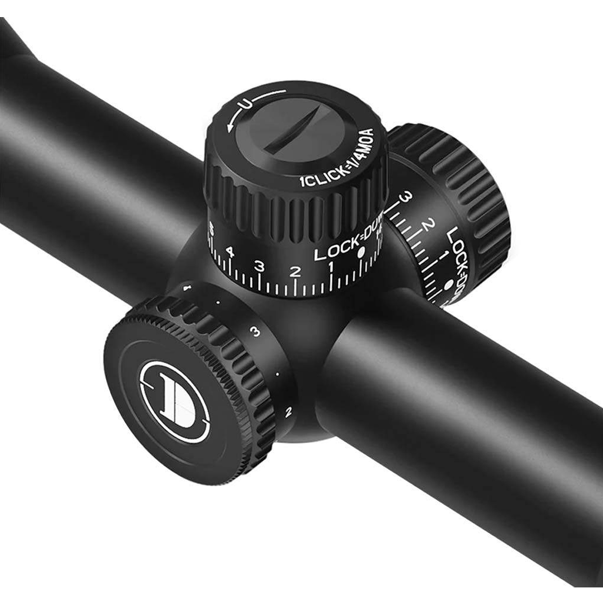 Зручність експлуатації дають продумані параметри: віддалення вихідної зіниці становить 83–72 мм, роблячи процес прицілювання комфортним і безпечним. Діаметр вихідної зіниці змінюється від 16,3 мм на мінімальному збільшенні до 5,5 мм на максимальному, надаючи достатню яскравість у різних режимах використання. Діапазон поправок складає 70 MOA по вертикалі та горизонталі, дозволяючи враховувати відхилення при різних дистанціях і умовах стрільби. Точність регулювання забезпечується ціною поділки у 1/4 MOA, а система Locking Turrets надійно фіксує барабани налаштувань, запобігаючи випадковому збиванню параметрів. Для адаптації під індивідуальні потреби передбачена діоптрійна корекція, це робить приціл універсальним для різних стрільців.